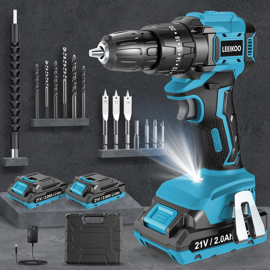 LEEIKOO Bürstenloser Akkuschrauber 21V, Akku Bohrschrauber mit 2 Akkus 2,0Ah, 45N.m Drehmoment, 20+3