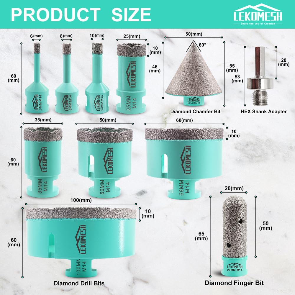 LEKOMESH Diamant Bohrkrone Kit - 11 Stück (6/8/10/25/35/50/68/100mm+20mm Diamant Fingerfräser+50mm D
