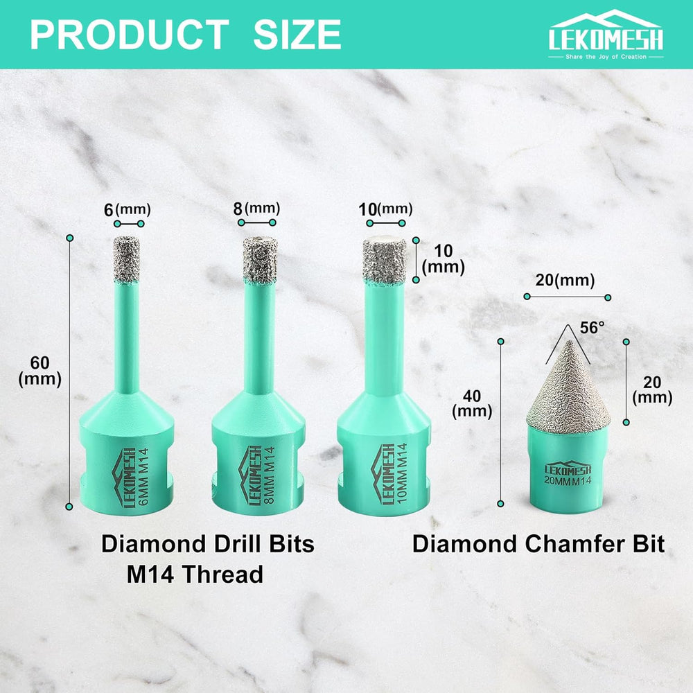 Diamant Bohrkrone Kit - 4 Stück (6/8/10mm+20mm Diamant Fasenfräser) LEKOMESH Diamant Lochsäge mit Pl