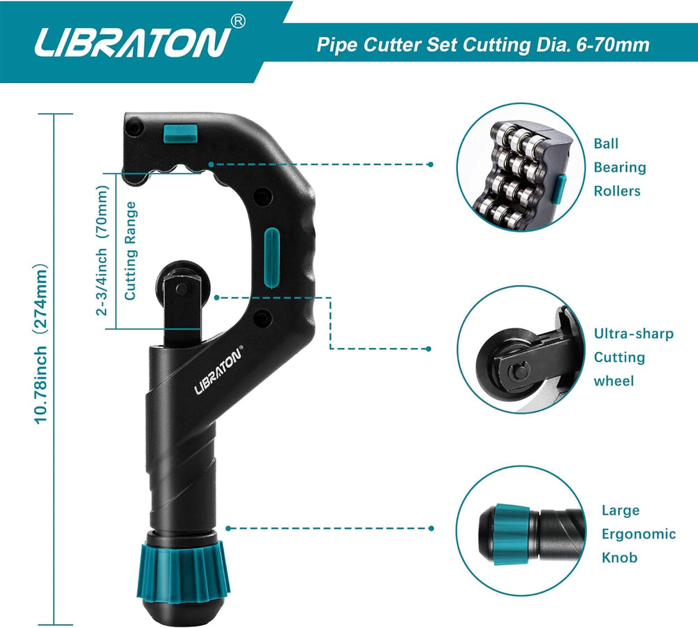 Libraton Rohrschneider 6-70 mm, Rohrabschneider, Kupferrohrschneider Set, Leitungsschneider mit Entg