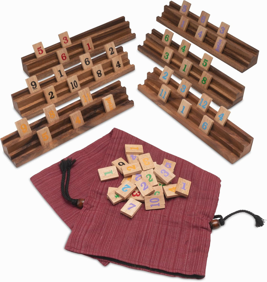 LOGOPLAY Rummy - Gesellschaftsspiel - Legespiel mit 108 Spielsteinen im Stoffbeutel - Halterungen un