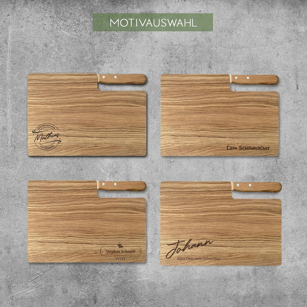 Personalisiertes Premium Frühstücksbrettchen mit Buckelsmesser, Wunsch-Name und Text graviert – Gesc