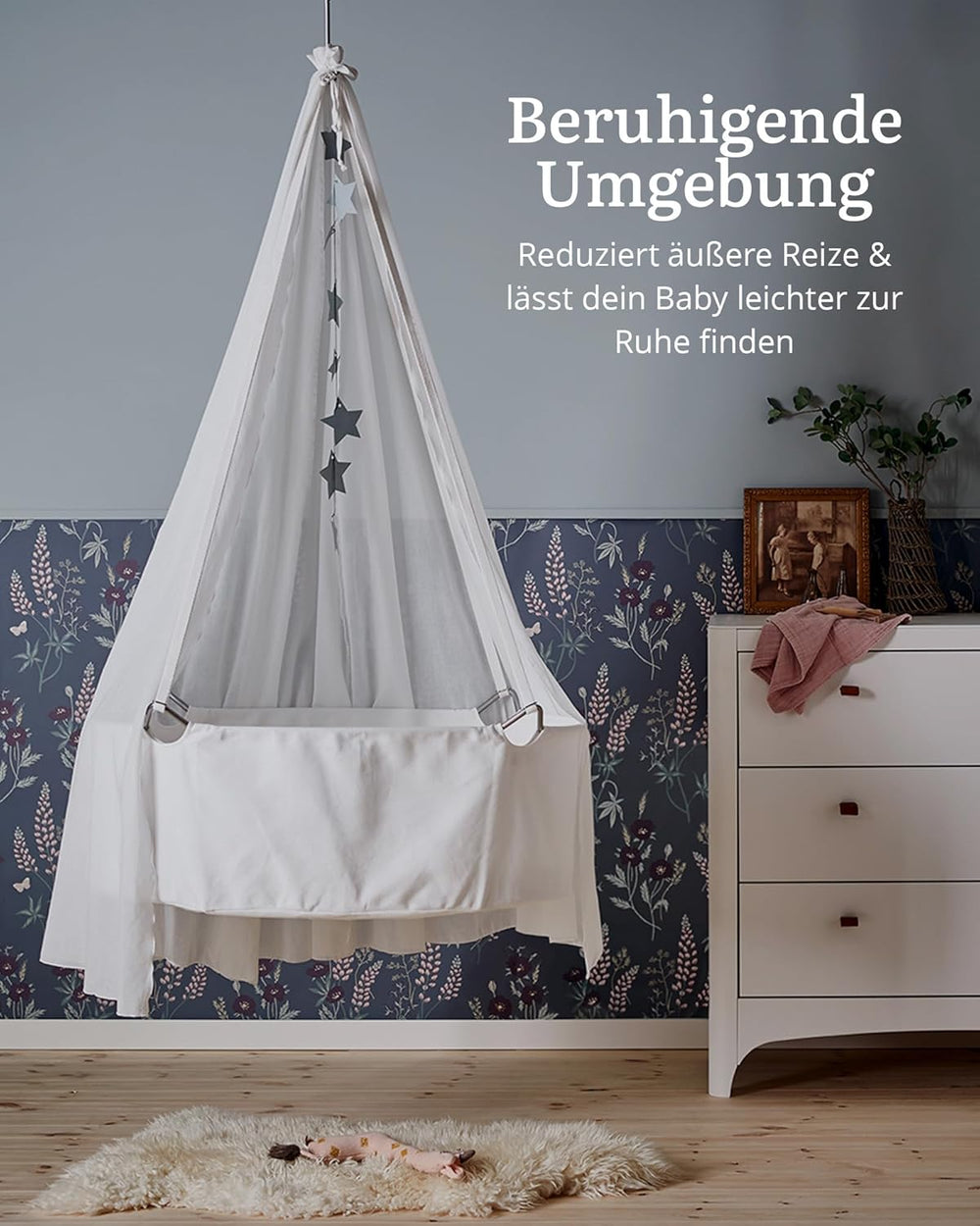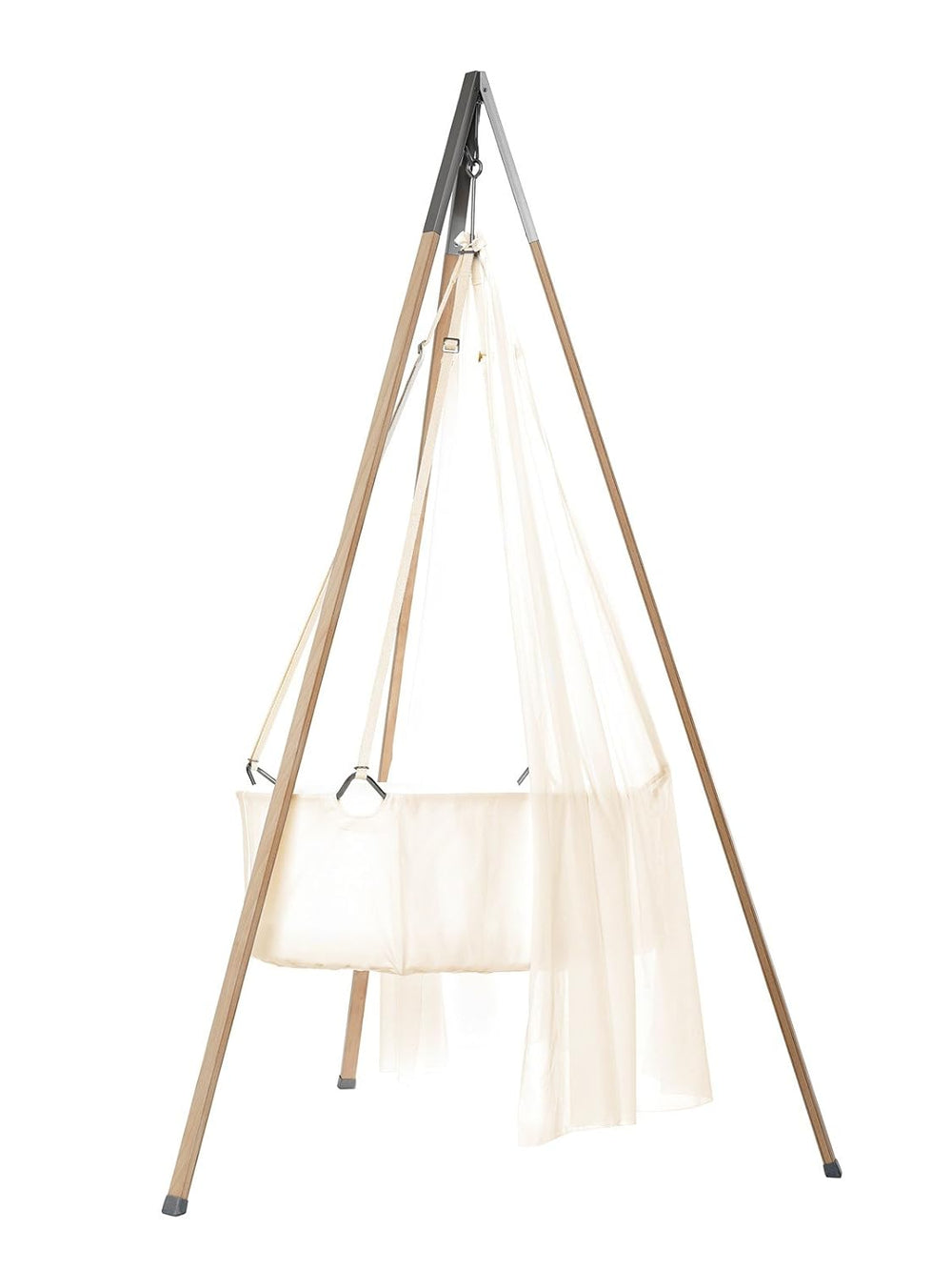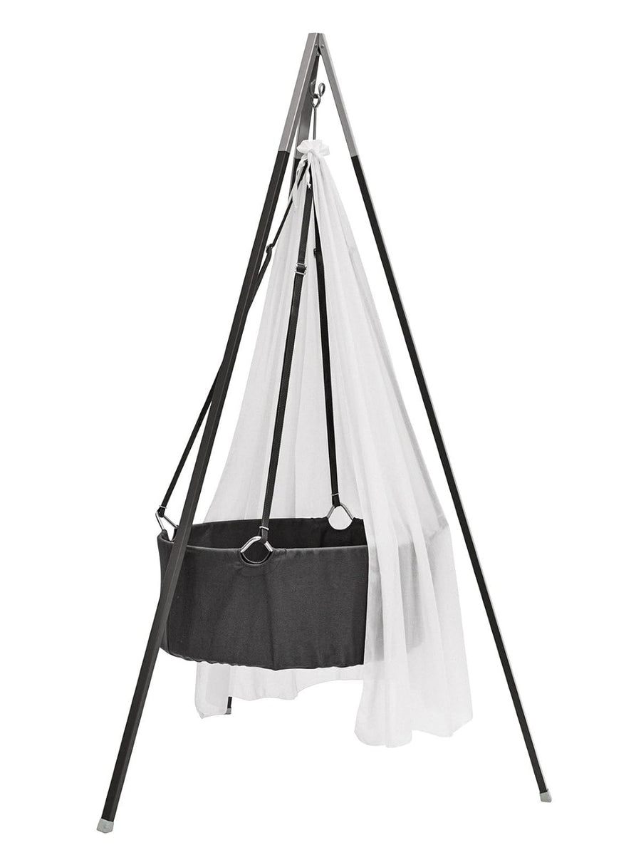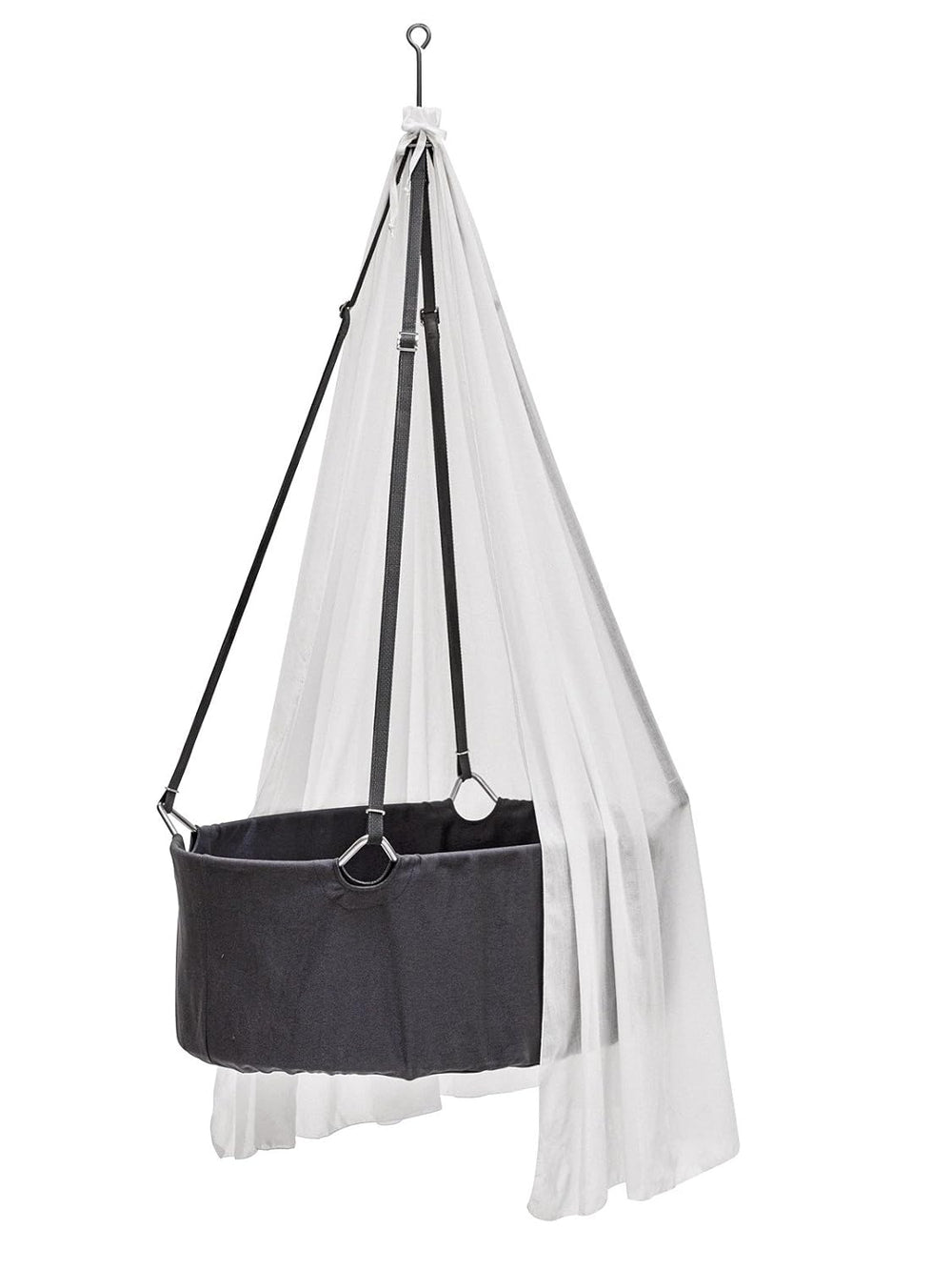 Leander Wiege - Babywiege grau inkl. Matratze und Deckenhaken - mit Himmel (Schleier) weiss + Stativ