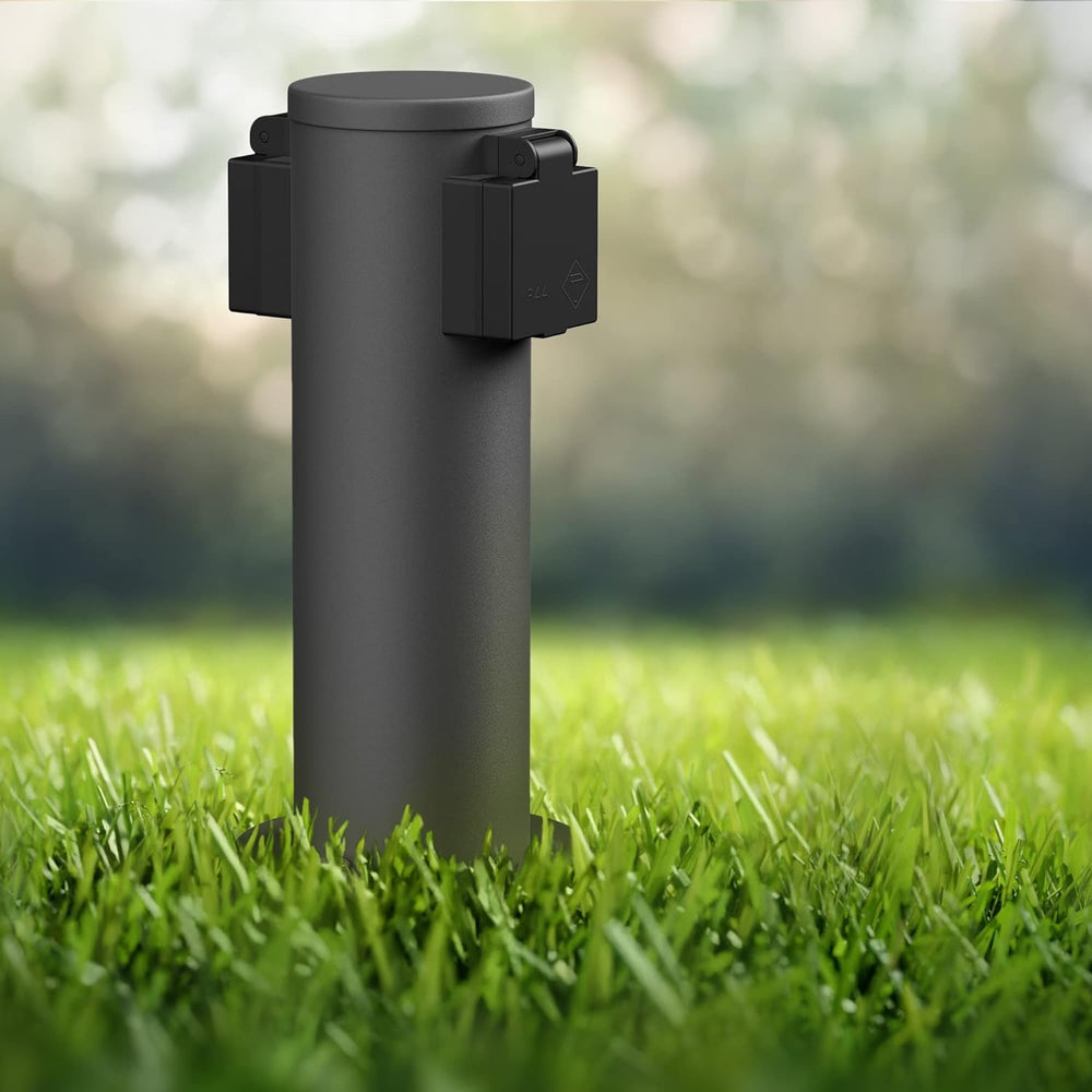ledscom.de Aussensteckdose PORU mit Erdspiess, wetterfest, 2-Fach, Edelstahl, anthrazit, rund, 27cm,