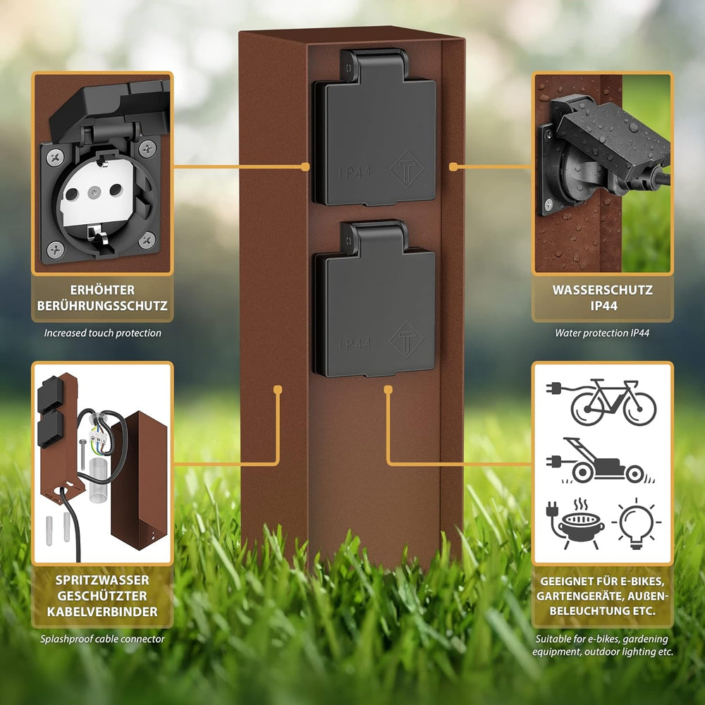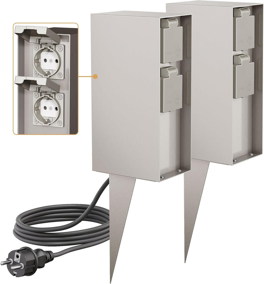 ledscom.de 2x Garten-Steckdosen-Säule POMI mit Erdspiess und 2m Kabel für aussen, IP44, 4-fach, edel