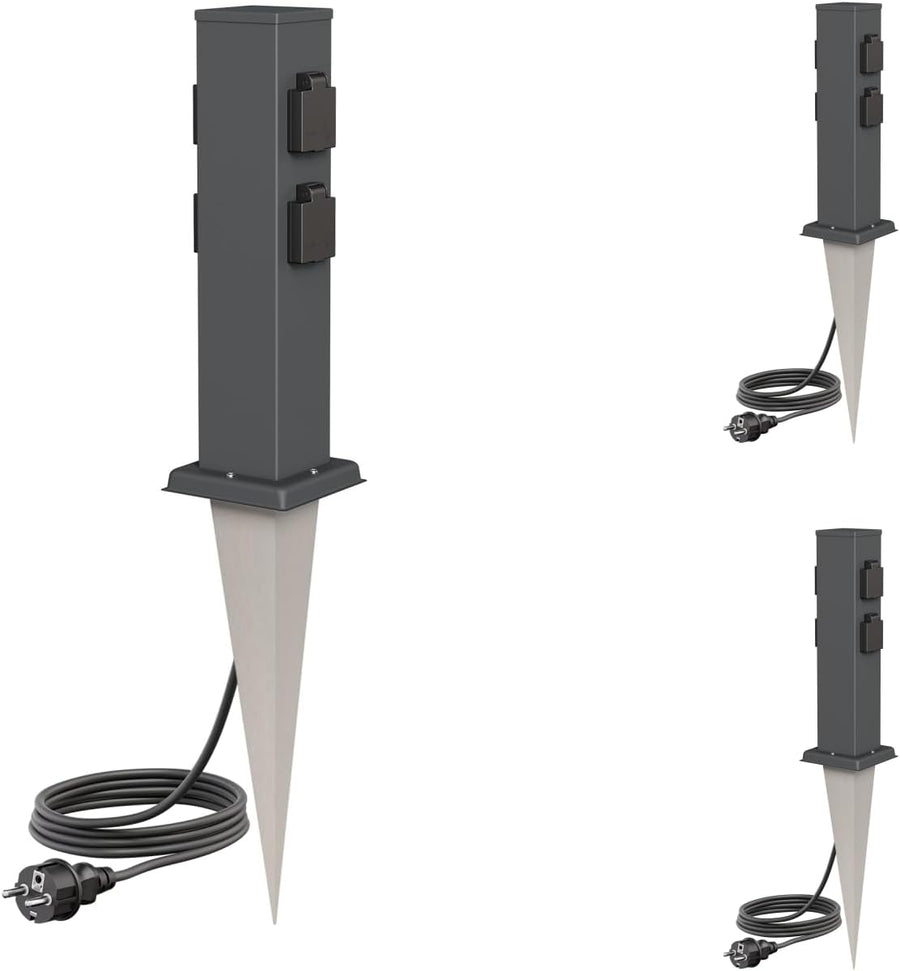 ledscom.de 3X Garten-Steckdosen-Säule Polly mit Erdspiess für aussen, IP44, 4-Fach, anthrazit, eckig