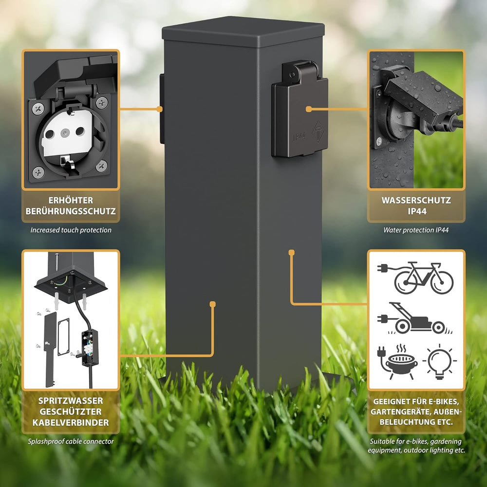 ledscom.de Aussensteckdose POMI mit Erdspiess, wetterfest, IP44, 2-fach, schwarz, eckig, 23cm, 3 Stk