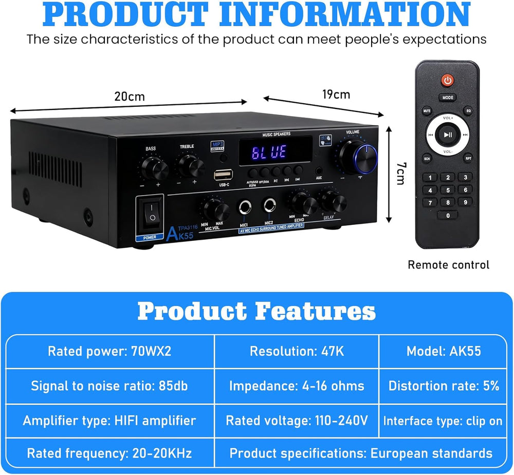 AK55 HiFi Verstärker Mini Bluetooth 5.0 Stereo Amplifier 2.0 Kanäle 70W X 2 Audio Verstärker Receive