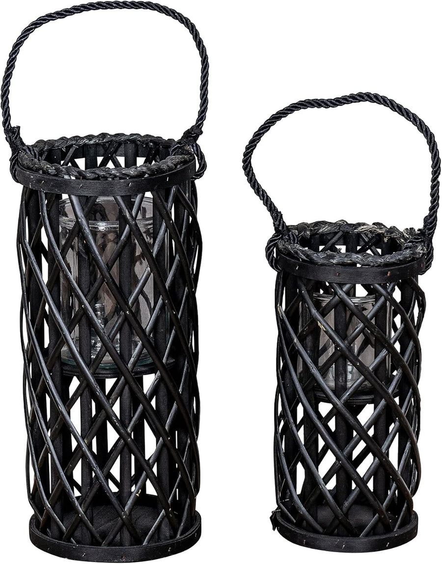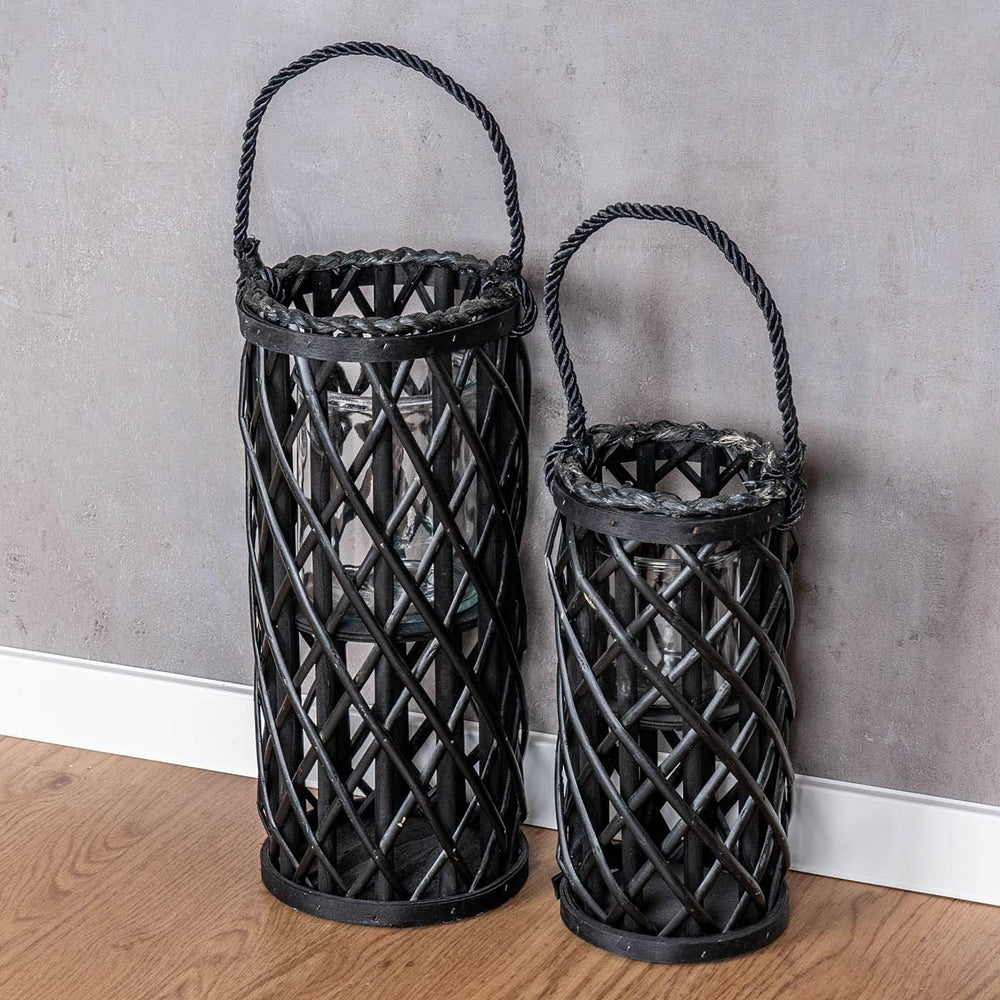 levandeo 2er Set Laterne Windlicht H40cm H31cm Schwarz Holz Weiden-Laterne geflochten Glaseinsatz Ke