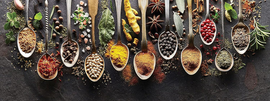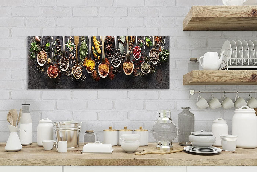 Glasbild 80x30cm Wandbild Glas Gewürze Kräuter Löffel Küche Deko Wanddeko Küchendeko Küchenbild