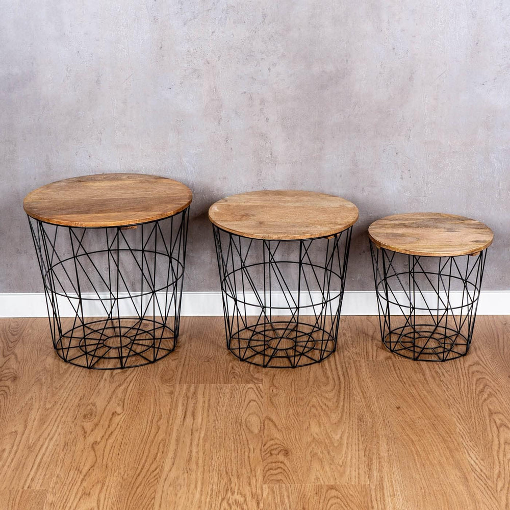 levandeo 3er Set Beistelltisch Metall Metallkorb Schwarz Mango Couchtisch Holz Deckel Deko Aufbewahr
