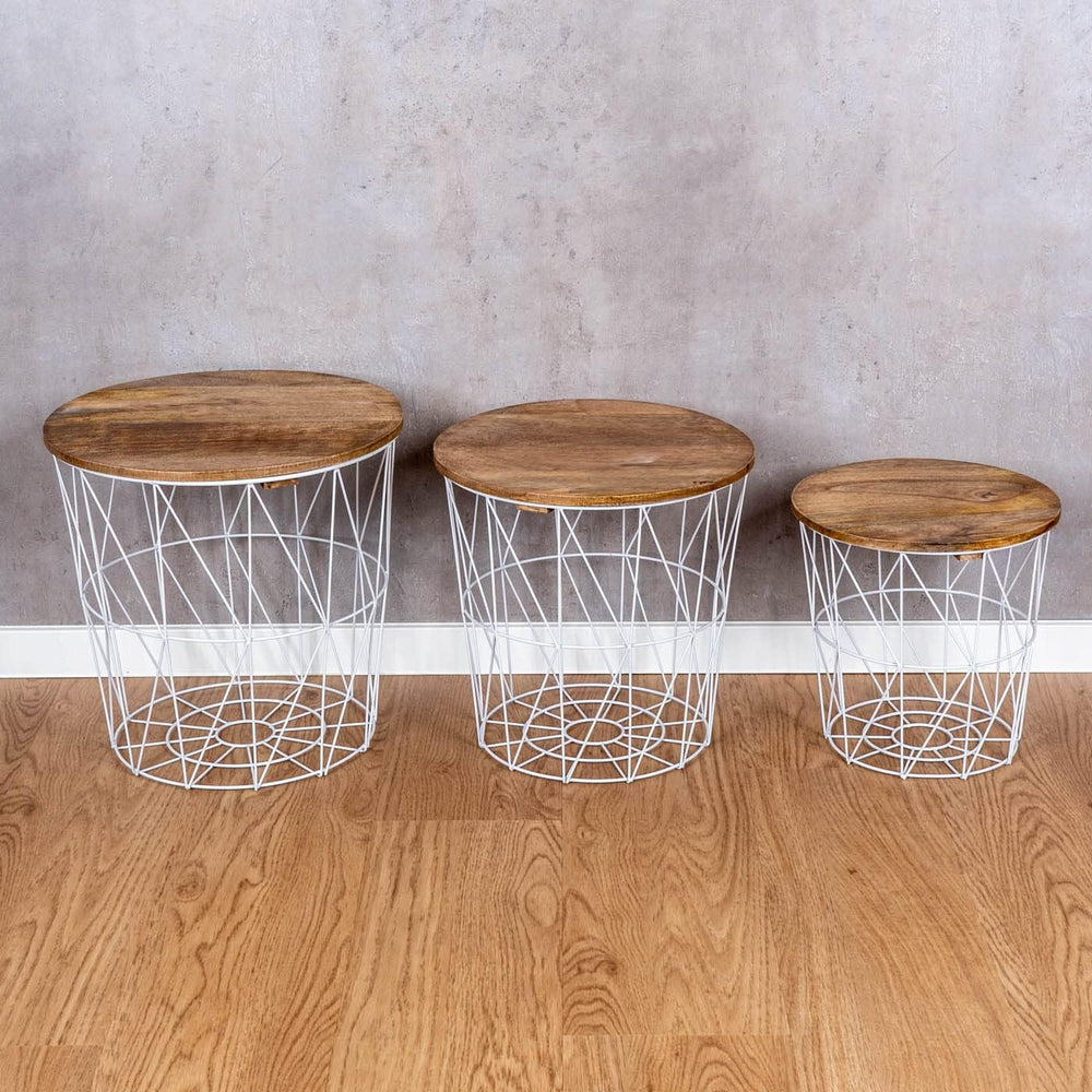 levandeo 3er Set Beistelltisch Metall Metallkorb Weiss Mango Couchtisch Holz Deckel Deko Aufbewahrun