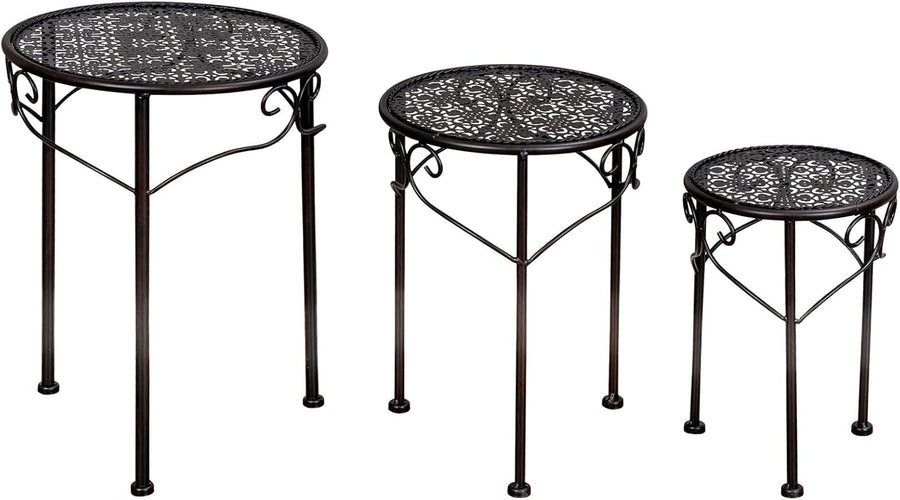 3er Set Blumenhocker Metall Schwarz Pflanzenständer Braun Rund Tisch Garten Deko Blumenständer, Schw