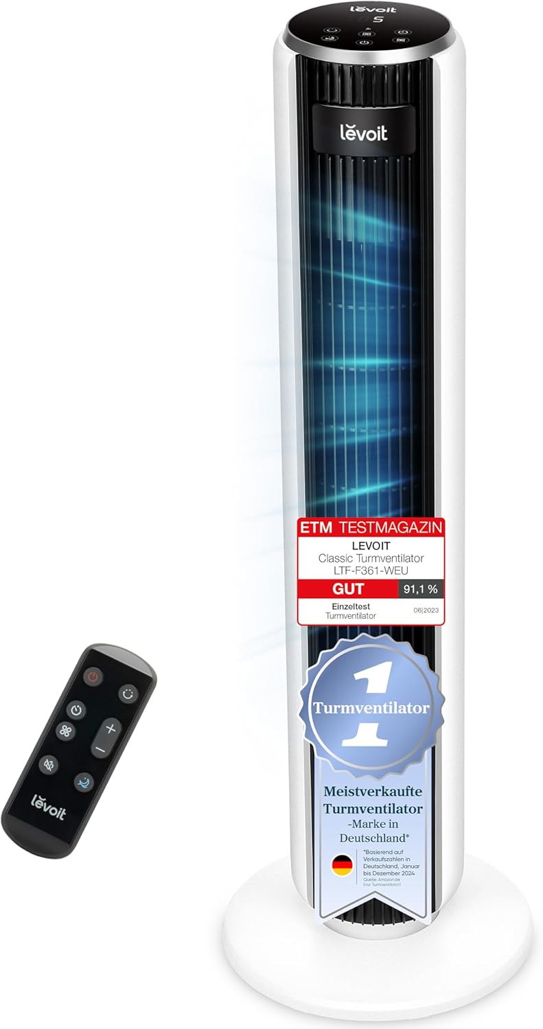 Levoit 28dB leiser 7m/s Turmventilator mit Fortschrittlichem Schlafmodus und Fernbedienung Akku Stau