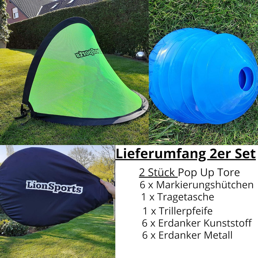 LionSports Fussballtor Set 2020 (NEU) - 2 Pop Up Tore - Mit Markierungshütchen – Ideale Fussballtore