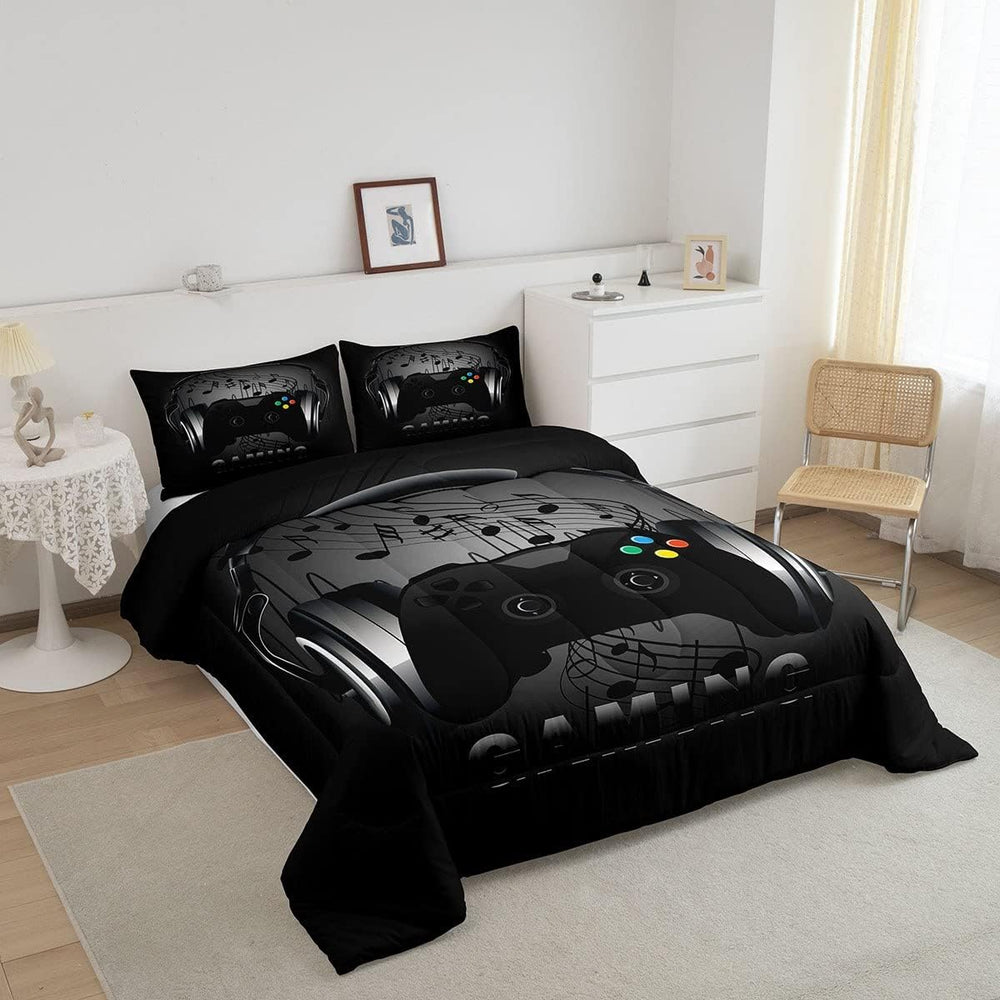 Gaming-Bettwäsche-Set mit Kopfhörern, Game-Controller, schwarz-grau, Videospiel-Dekoration, Musik-Me