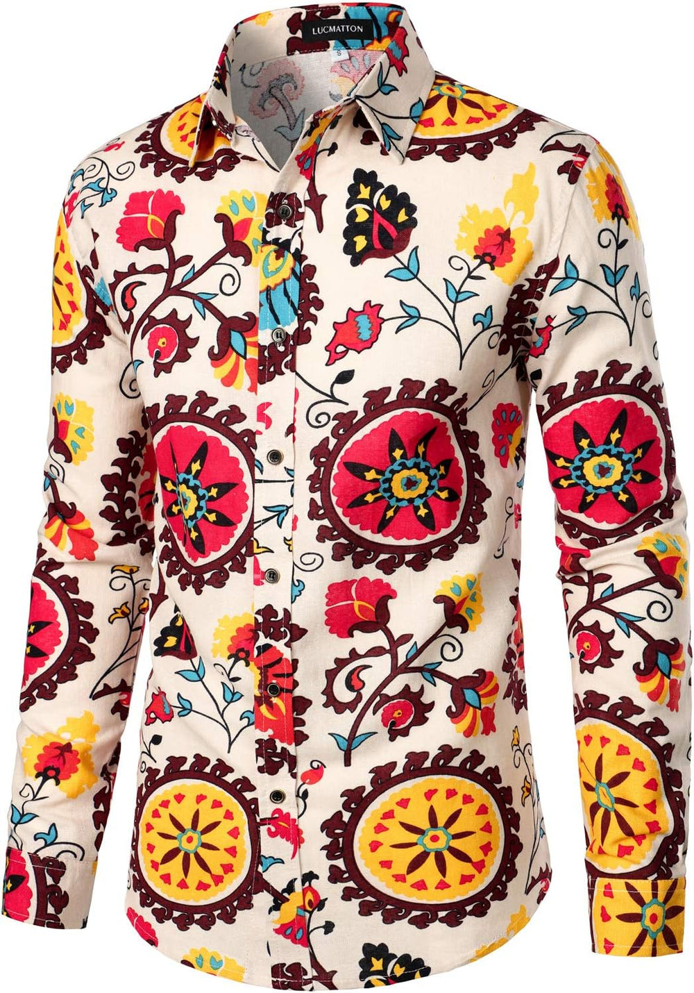 LucMatton Herrenhemd aus Leinen, mit stilvollen, afrikanischen, traditionellen Druckmustern, Langarm