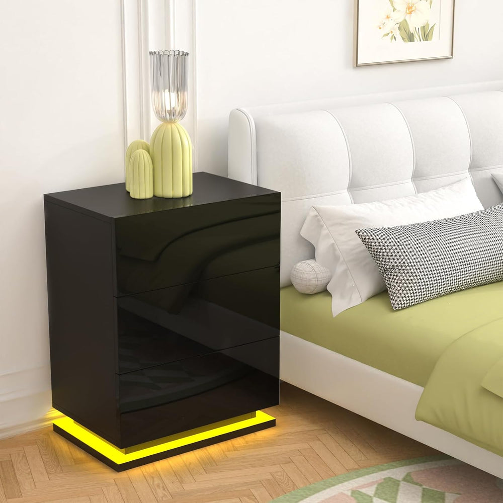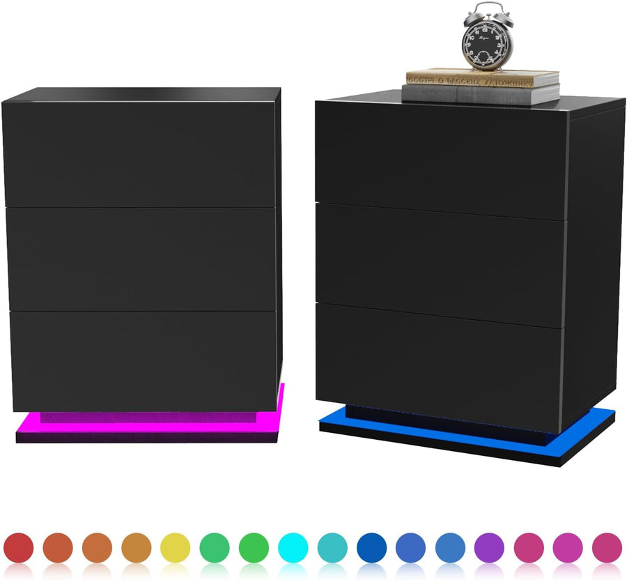 Lvhecforhm 2er Set Nachttisch Schwarz, Nachttische Hochglanz Front, Nachttisch Schwarz mit 3 Schubla