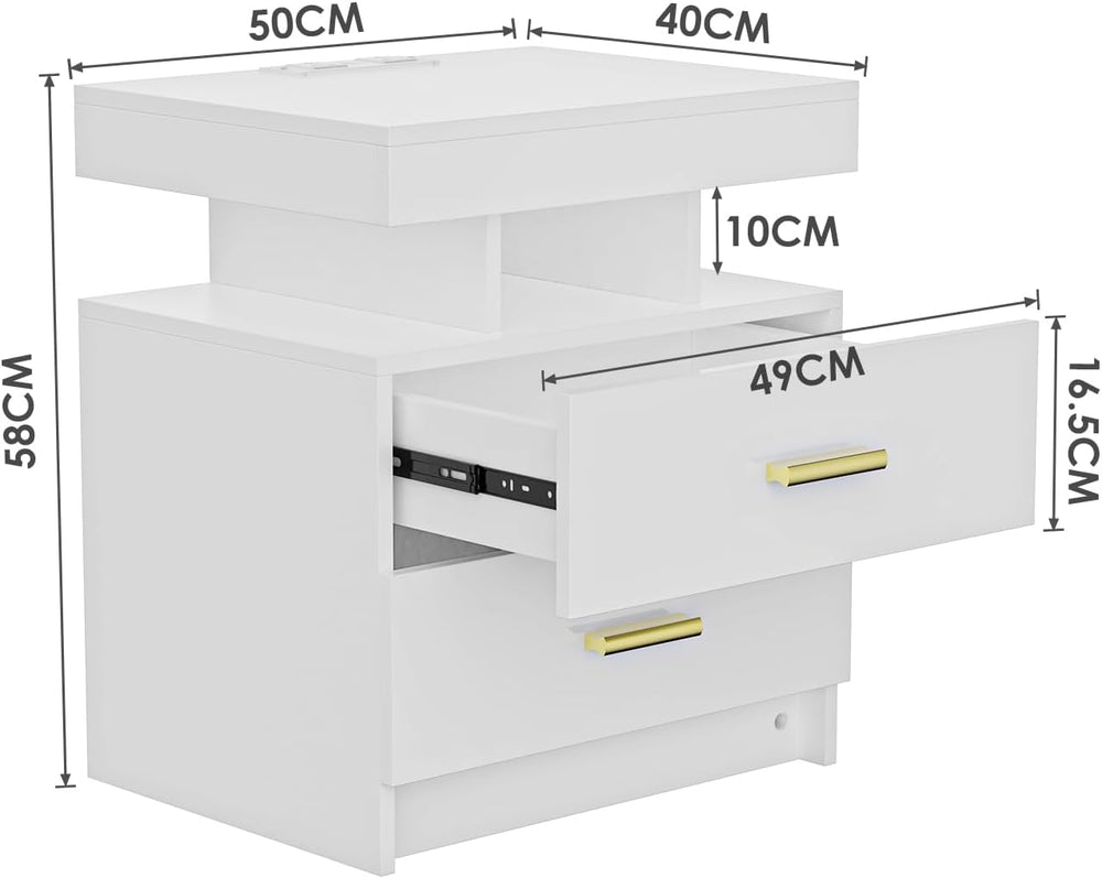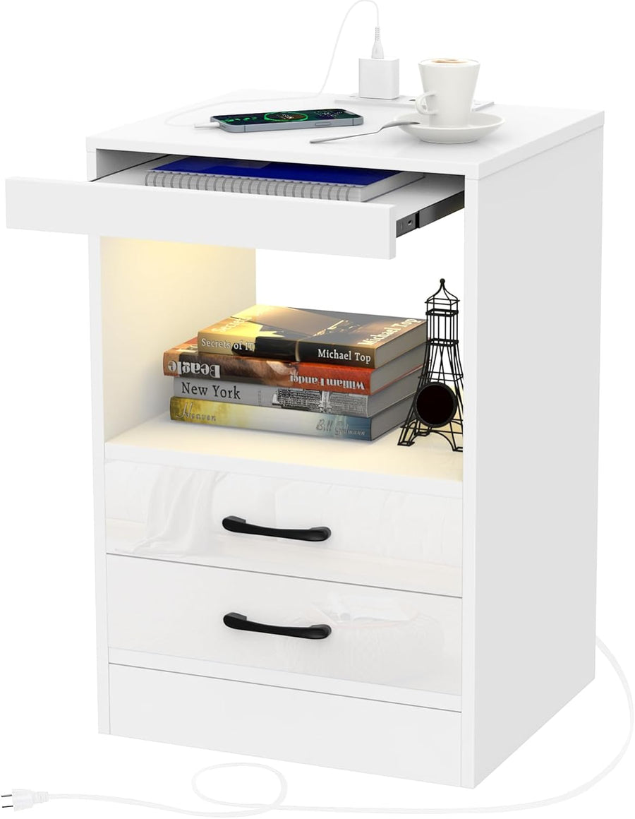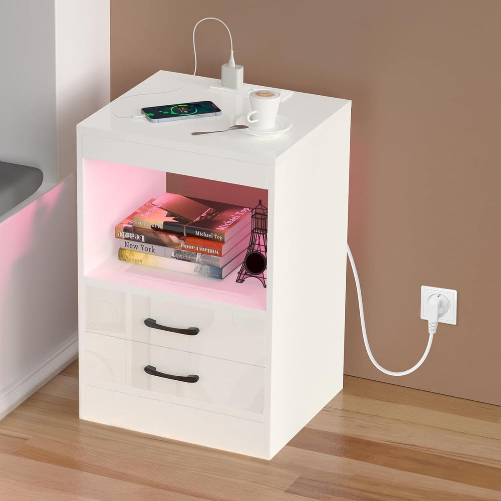 Lvhecforhm Nachttisch mit Steckdosen, Nachttisch Weiss Einstellbares Licht, Nachttische mit 2 Schubl