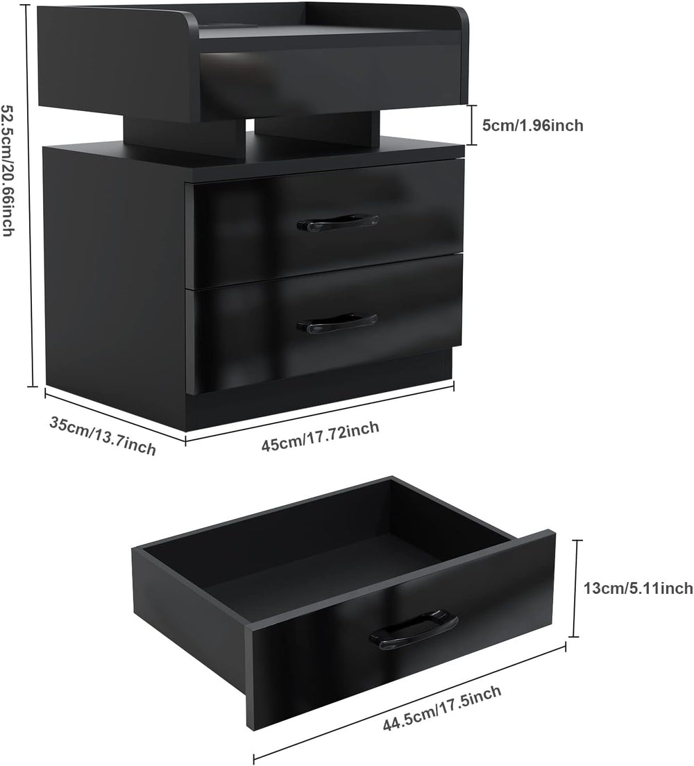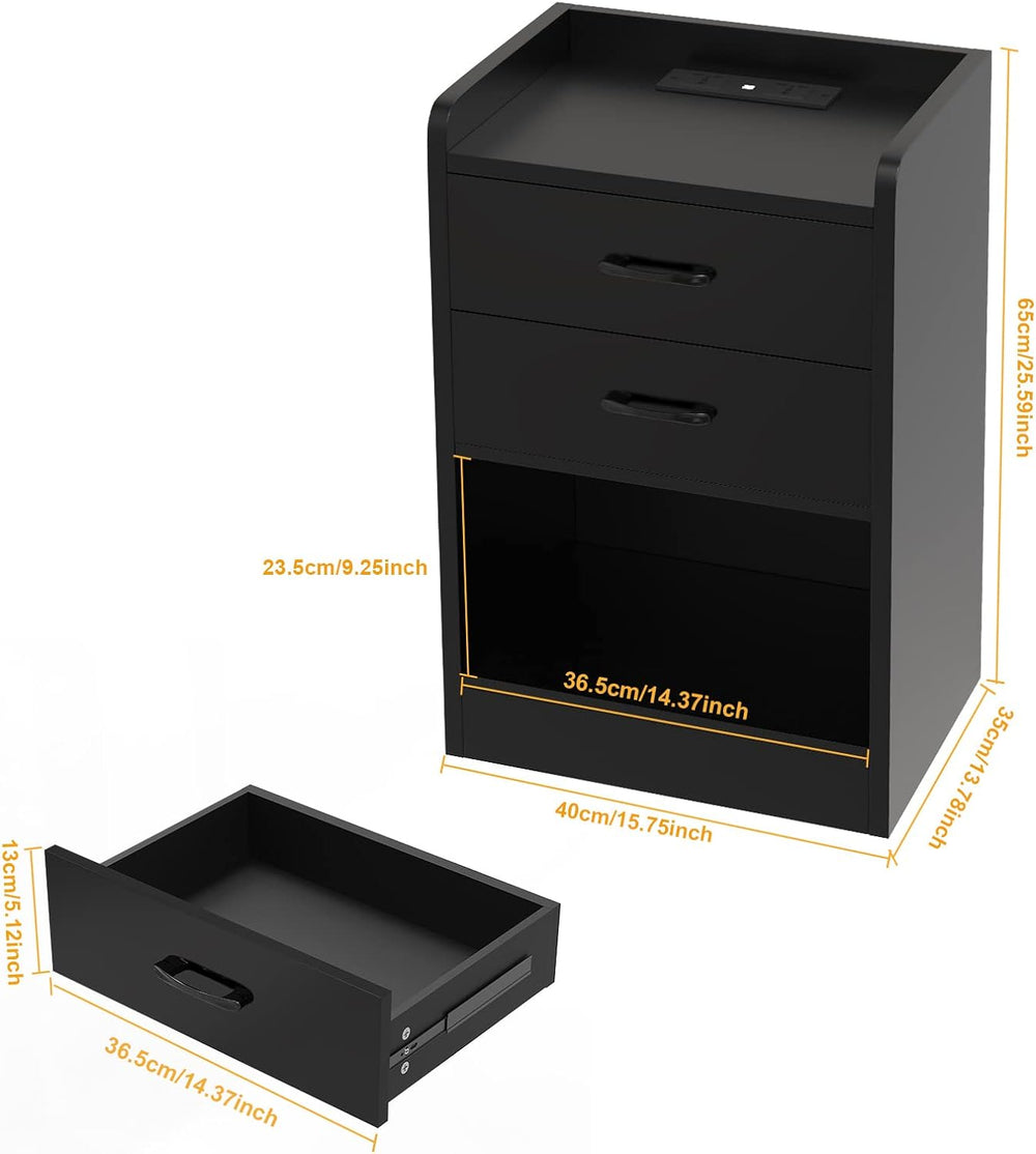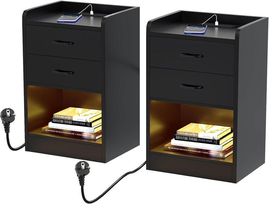 Lvhecforhm Nachttisch Schwarz, Nachttisch mit Steckdosen, Nachttische mit 2 Schublade und Offenen Fä