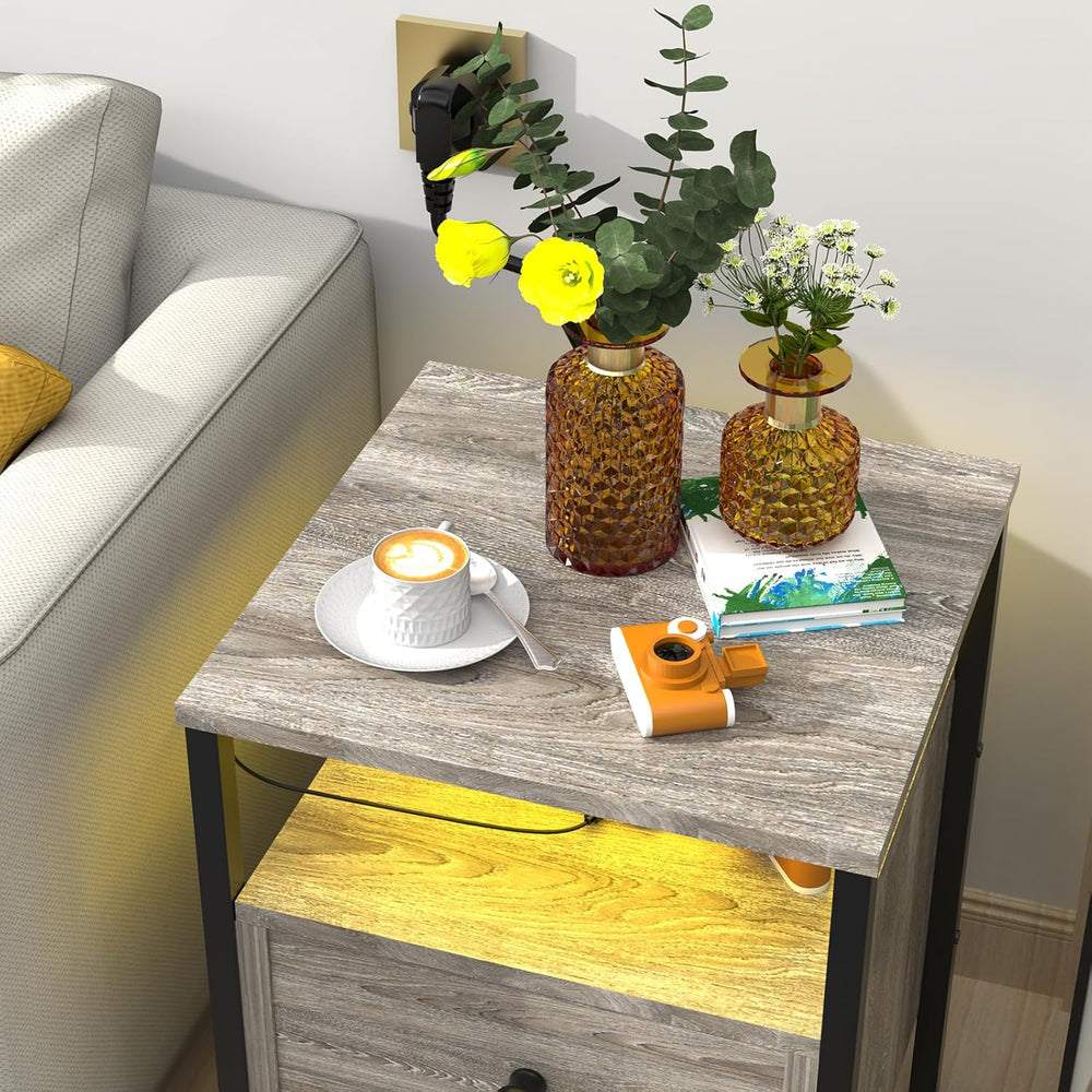 Lvhecforhm Nachttisch mit Steckdose, Beistelltisch mit USB-Anschlüssen, mit LED Licht, Beistelltisch