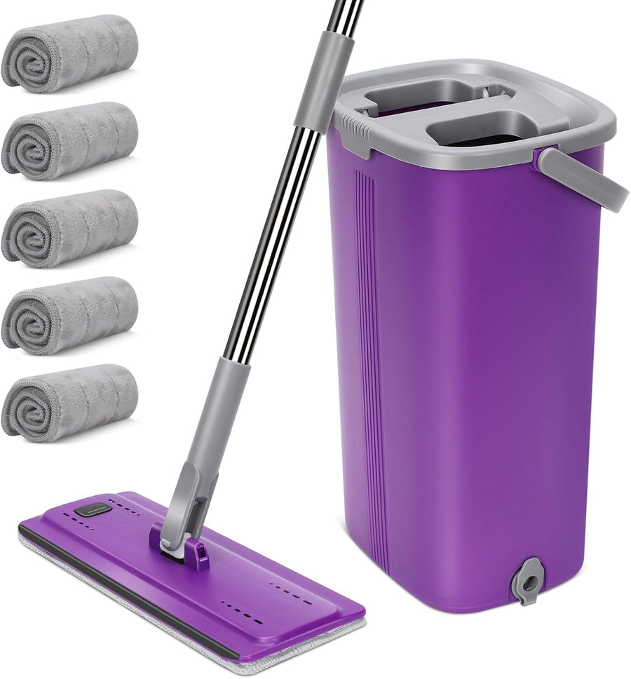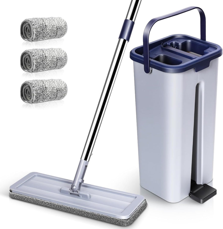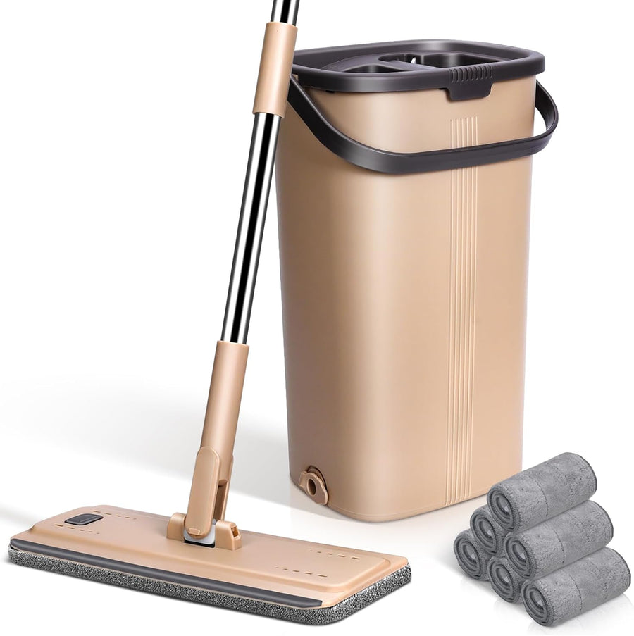MASTERTOP Bodenwischer Set mit Eimer, Flacher Wischmopp mit 6 Mikrofaser Pads für Nass-Trockennutzun