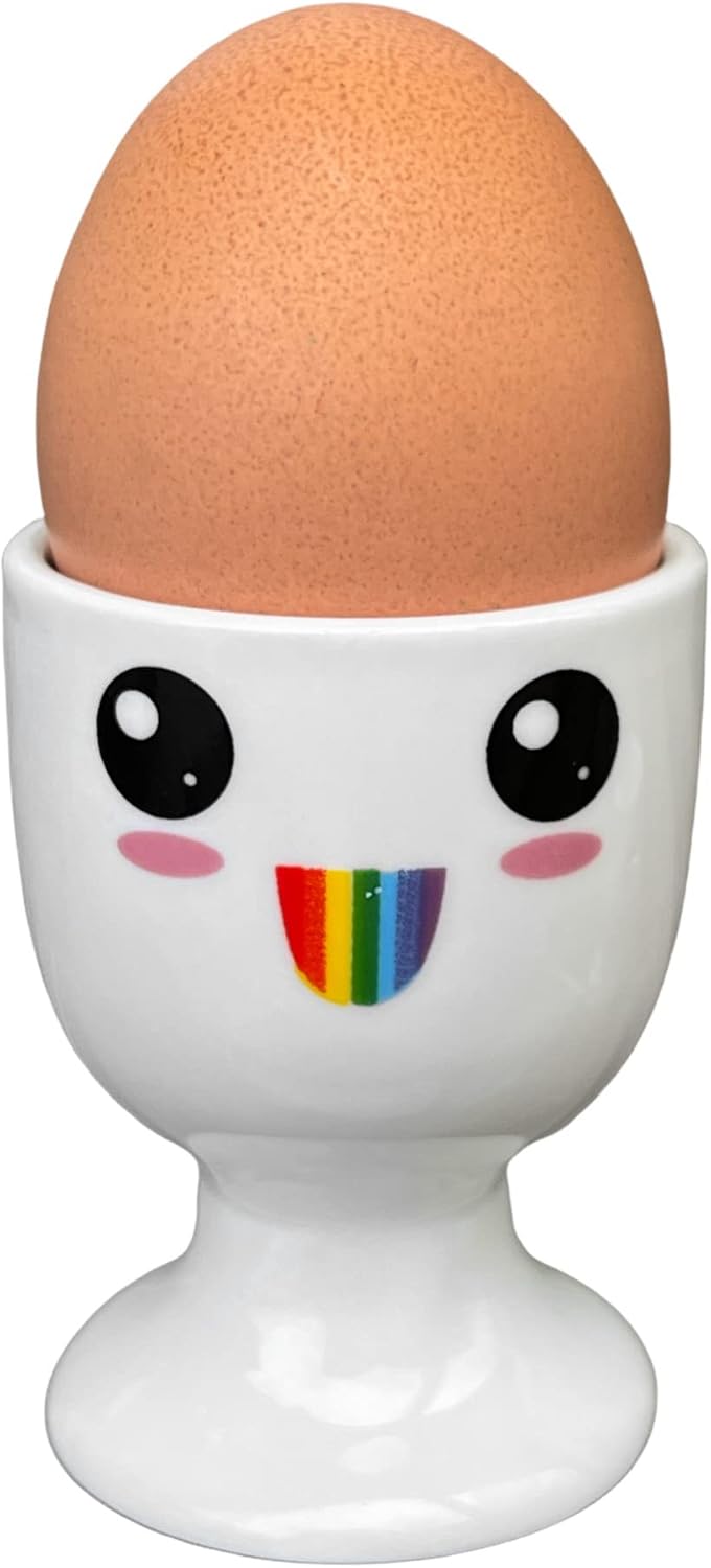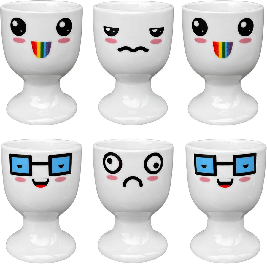 MIJOMA 6 Stück Set Eierbecher Eierhalter Eierständer weiss mit Gesichter Dekor #3, aus Porzellan je