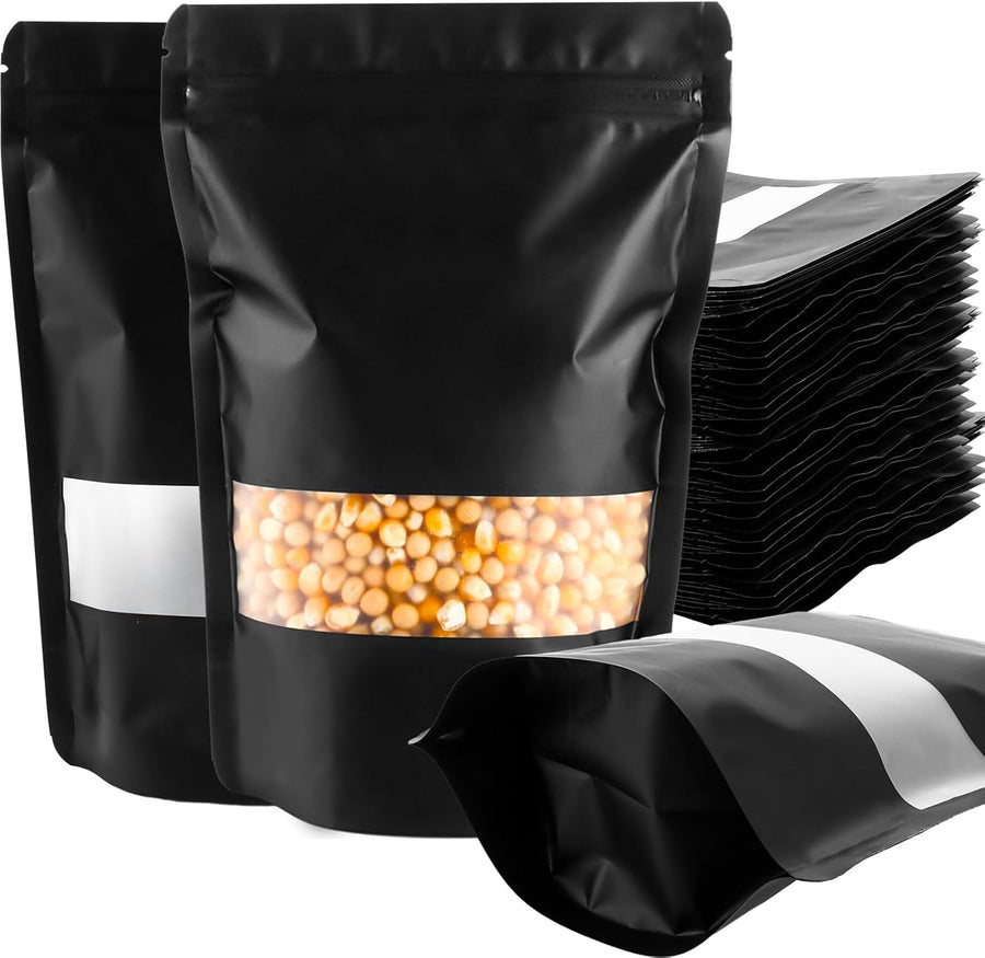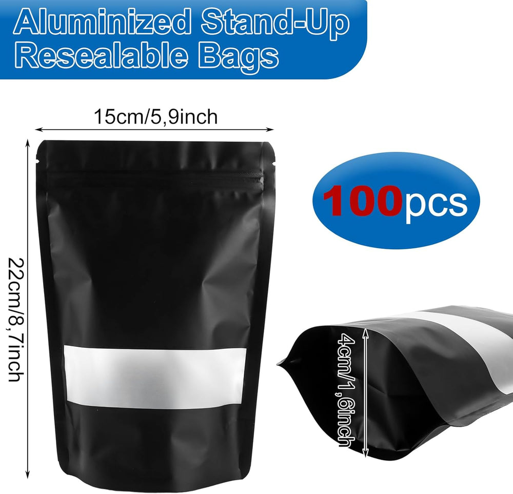 MIVIDE 100 Stück Wiederverschliessbare Mylar Beutel, 15 x 22 cm Standbodenbeutel mit Fenster Schwarz