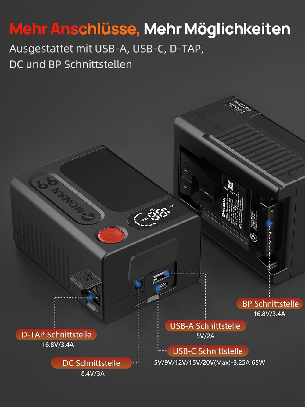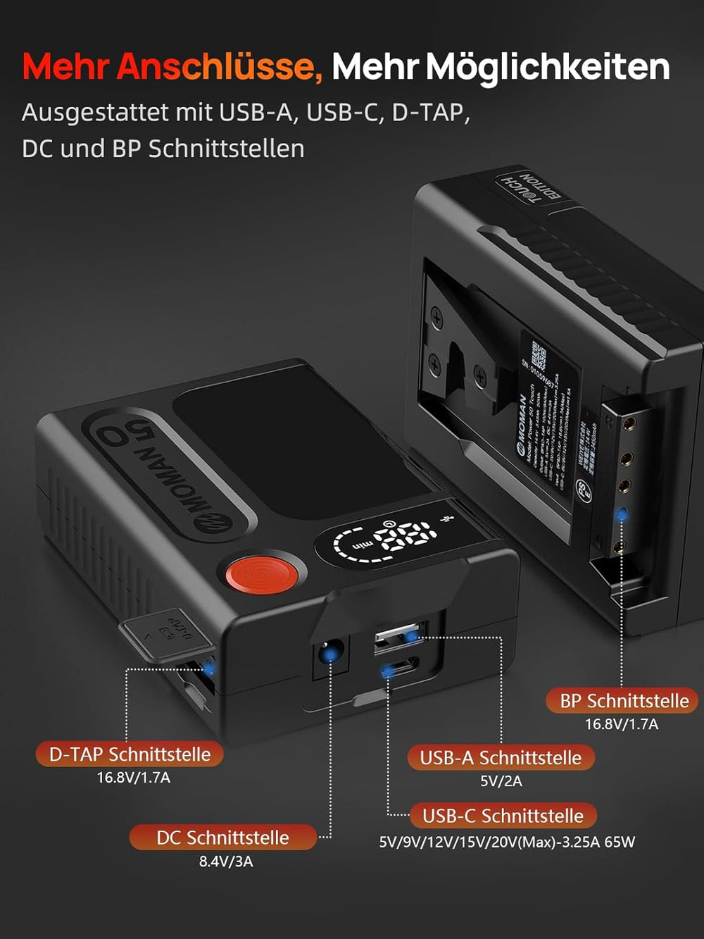V Mount Akku, Moman Power 95 Klein V-Lock Batterie 95Wh 6450mAh 14.8V mit 2×D-TAP/USB-A/BP Ausgang,