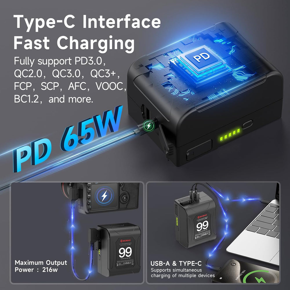 V-Mount Akku, Moman Power99 V-Lock Battery mit Dual D-Tap & 65W PD USB-C Output 99Wh/14.4V 15A 200W