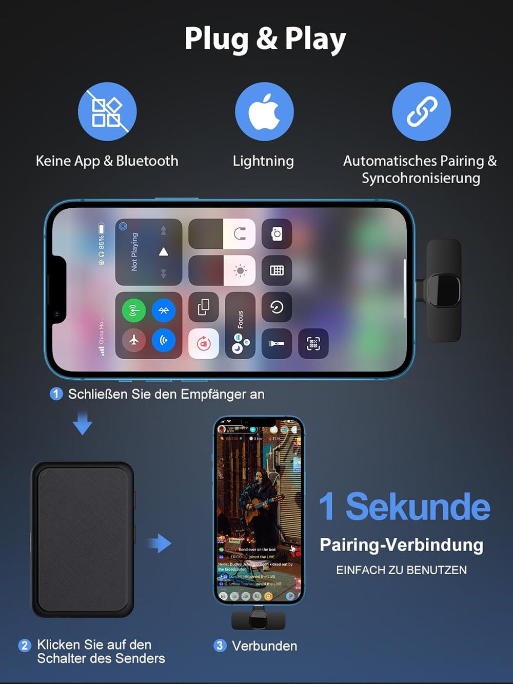 Handy Mikrofon Mini,Gimpro MC1(A) 2.4GHz【Lightning】PLUG&PLAY Ansteckmikrofon mit Ladekoffer 3 Mode D