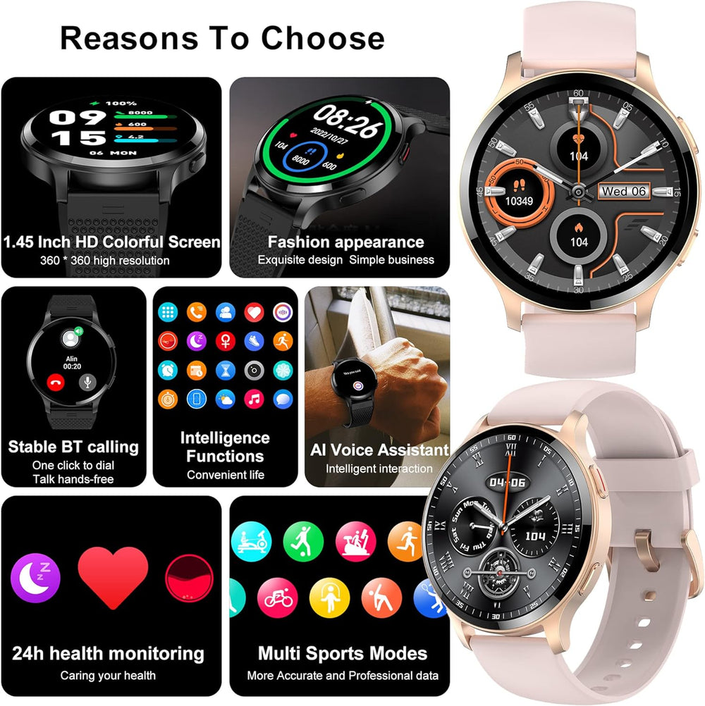 Smartwatch Damen mit Telefonfunktion 1,43" HD Voll Touchscreen Uhren Fitness Tracker 15 Sportmodi Ak
