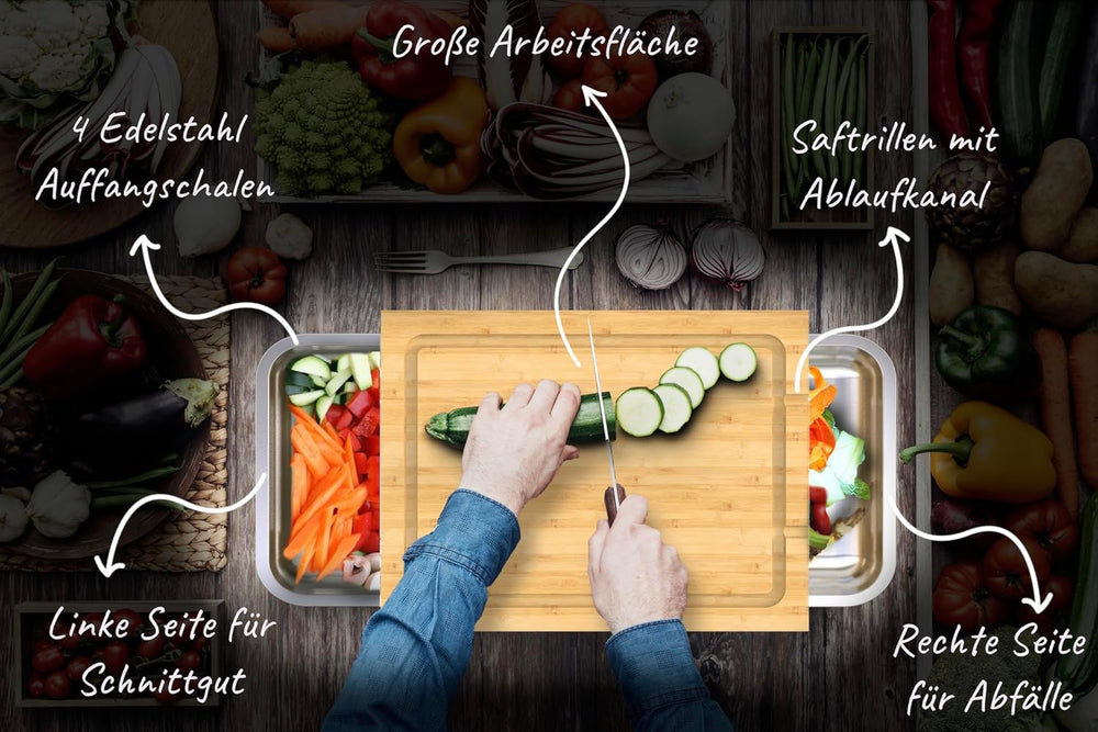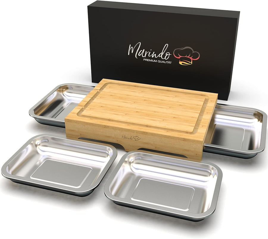 MARINDO Schneidebrett mit 4x Auffangschalen inkl. Saftrille | Schneidbrett aus Bambus | Auffangwanne