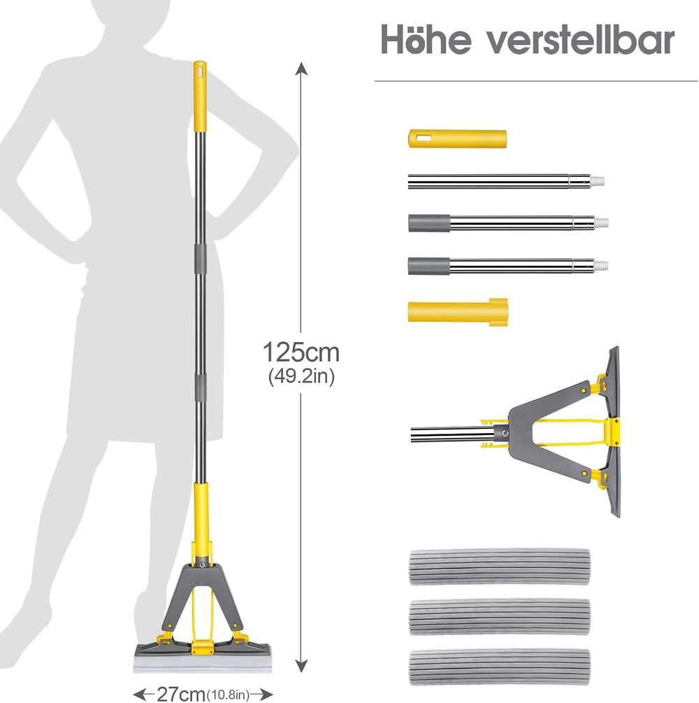 Masthome Schwamm Wischmopp,Schwammwischer mit 128cm Stiel Saugfähig Schwamm Bodenwischer mit 3 Schwa