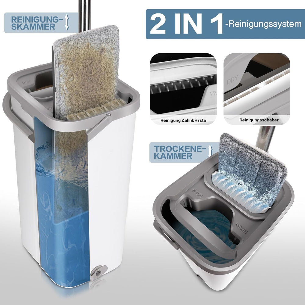Masthome Wischmopp und Putzeimer Set - Zwei-Kammer Putzset mit Flacher Bodenwischer für Nass-Trocken
