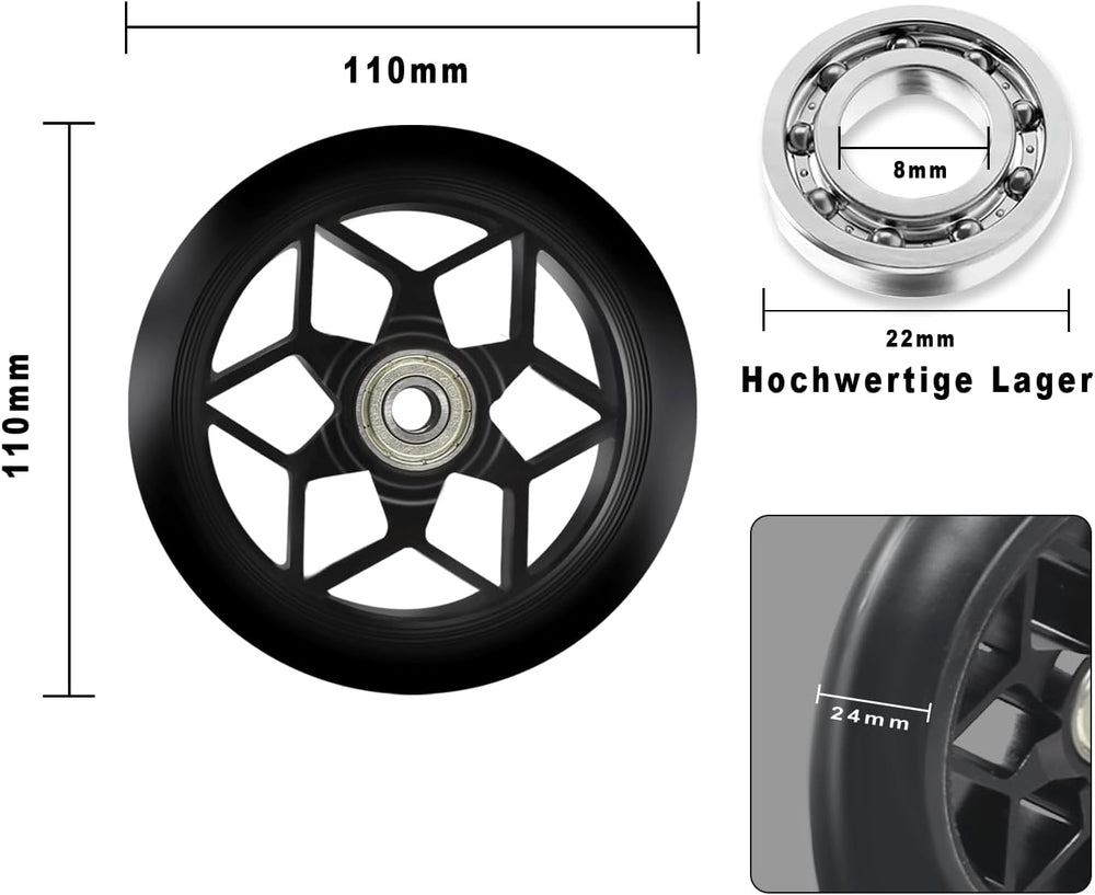 MaxEarn 2 Stück Scooter Ersatzräder 110 mm, Schwarz Stunt Scooter Rollen mit ABEC-9 Kugellager, Härt