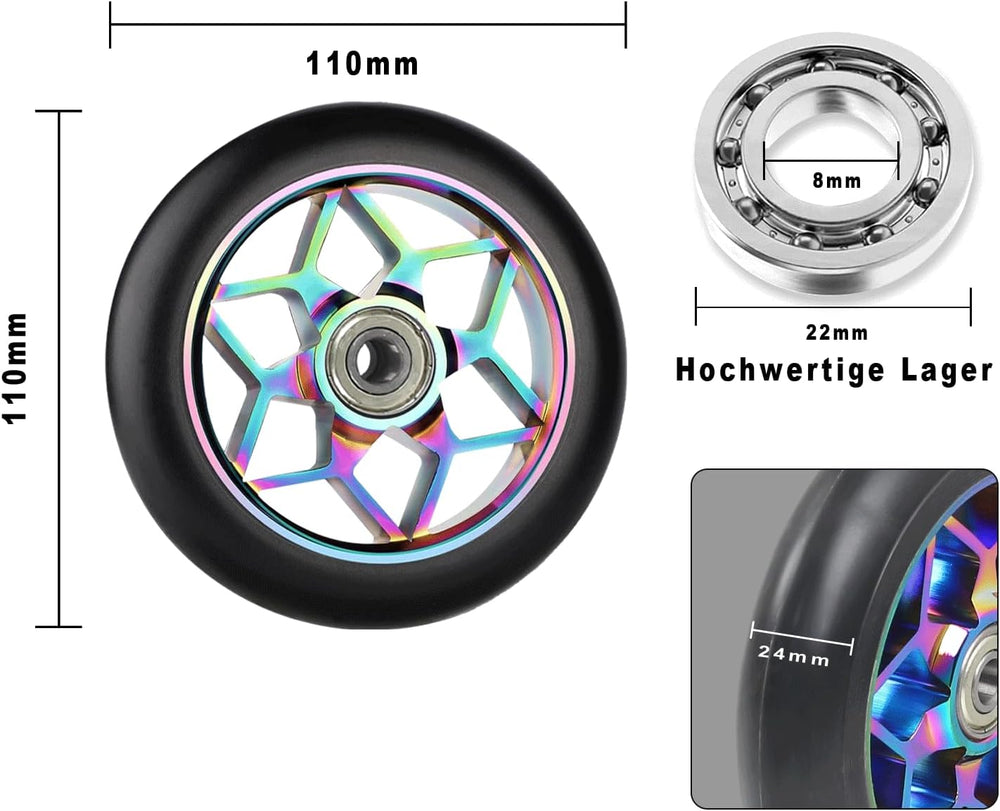MaxEarn 2 Stück Scooter Ersatzräder 110 mm, Bunt Stunt Scooter Rollen mit ABEC-9 Kugellager, Härtegr