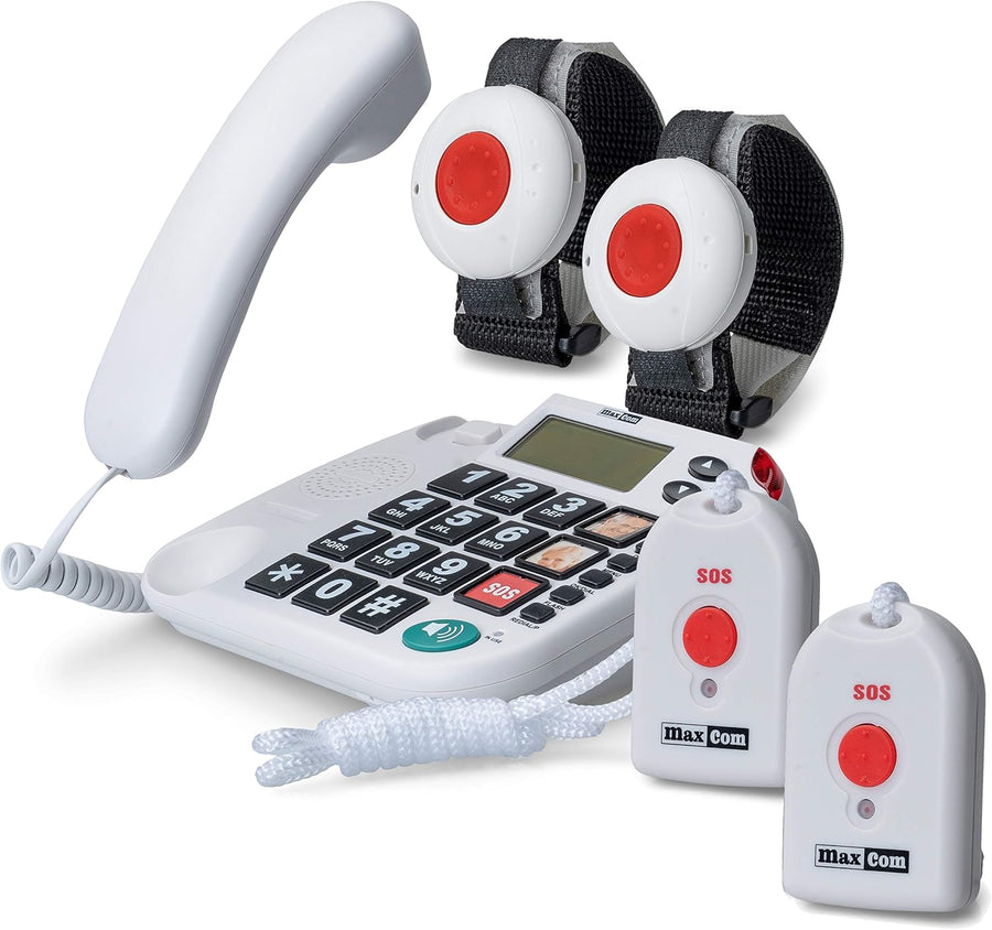 Maxcom KXTSOS: Seniorentelefon, schnurgebundenes Festnetztelefon mit 2 Armband- und 2 Umhängesender,
