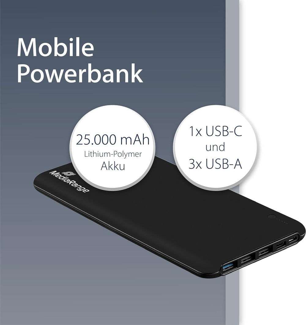 MediaRange Mobiles Ladegerät I Powerbank 25.000mAh, 3x USB-A und 1x USB-C®, unterstützt USB-C® Power