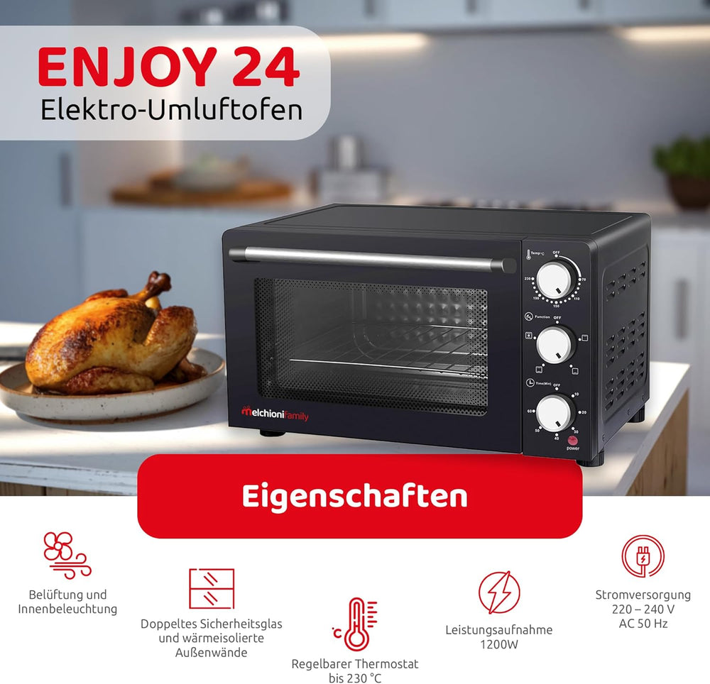 Melchioni family ENJOY 24 Elektro belüfteter Ofen 24 Liter, Legierter Stahl, 24 liters, Schwarz