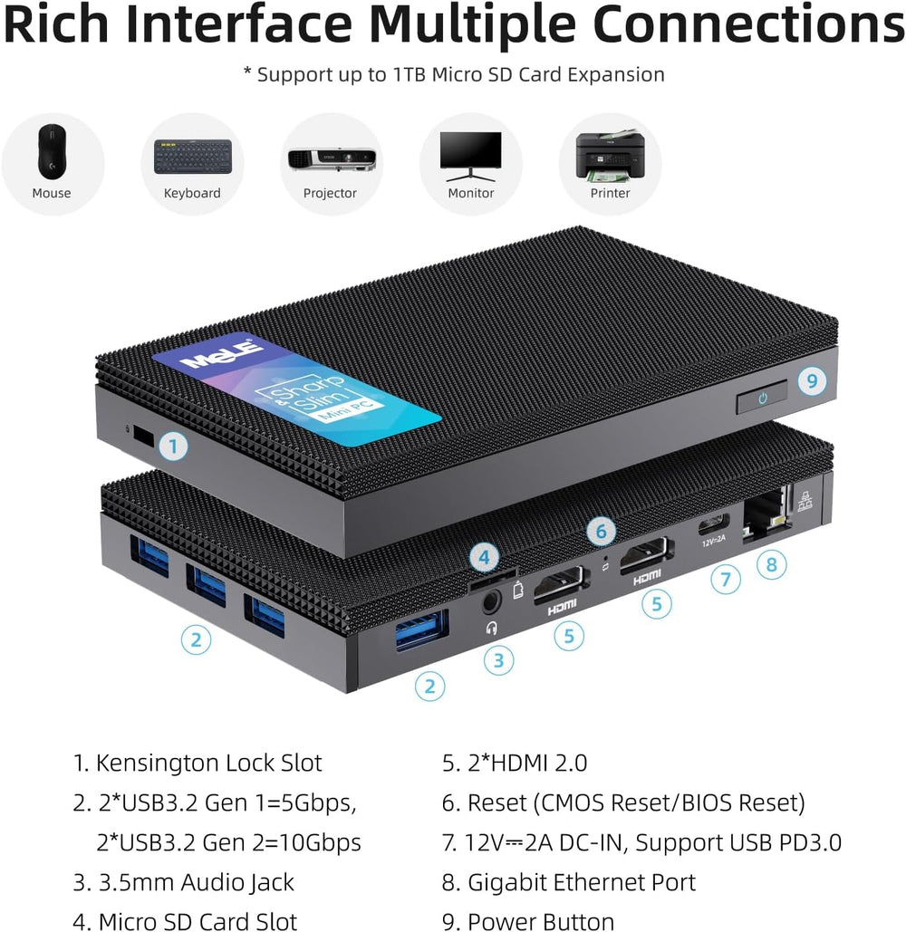 MeLE Mini-PC Overclock4C, Reddot-Gewinner 2024, Win 11 Pro N100 32GB 512GB, 4K-HDMI-Anzeige, USB-C P