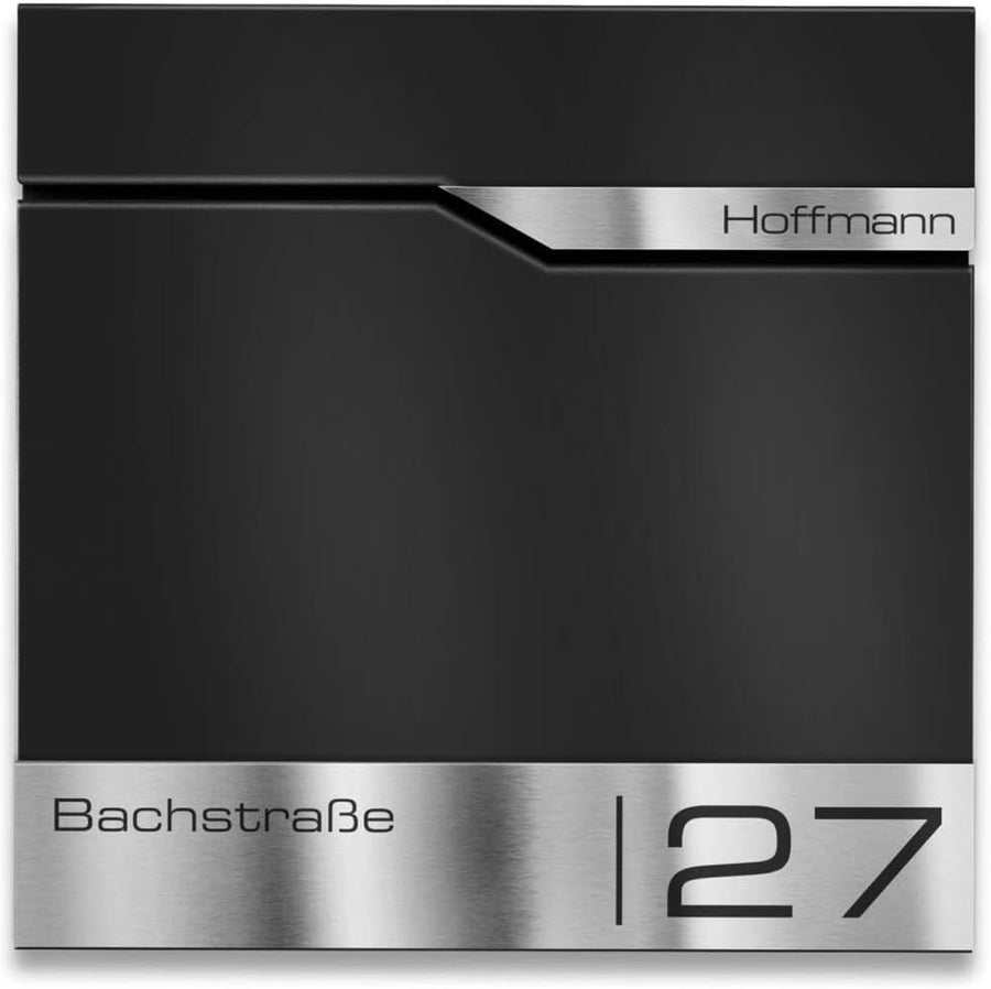 Metzler moderner Briefkasten Schwarz matt personalisiert mit Edelstahl-Namensschild, RAL9005 Tiefsch