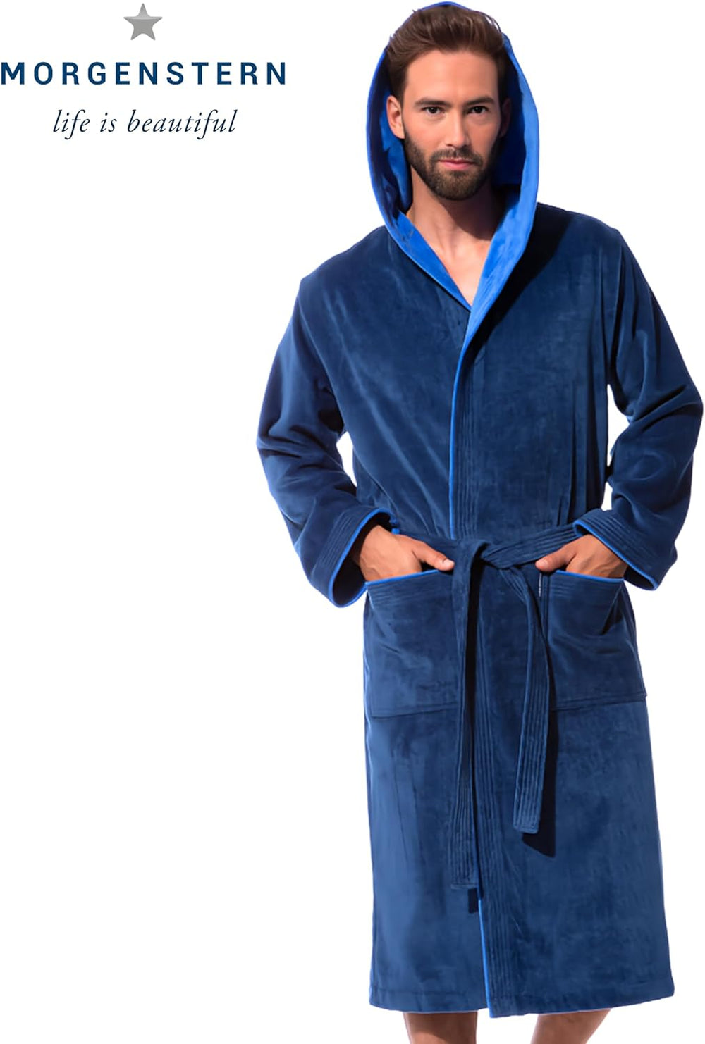 Morgenstern Bademantel Herren Kapuze 100% Baumwolle Frottee Velours Lang Finn M Blau, M Blau