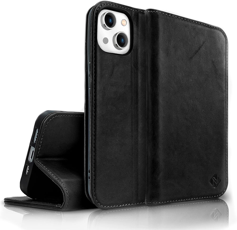 NALIA Echt-Leder Flipcase kompatibel mit iPhone 14 Plus Hülle, Handgefertigt Rindsleder Schutzhülle