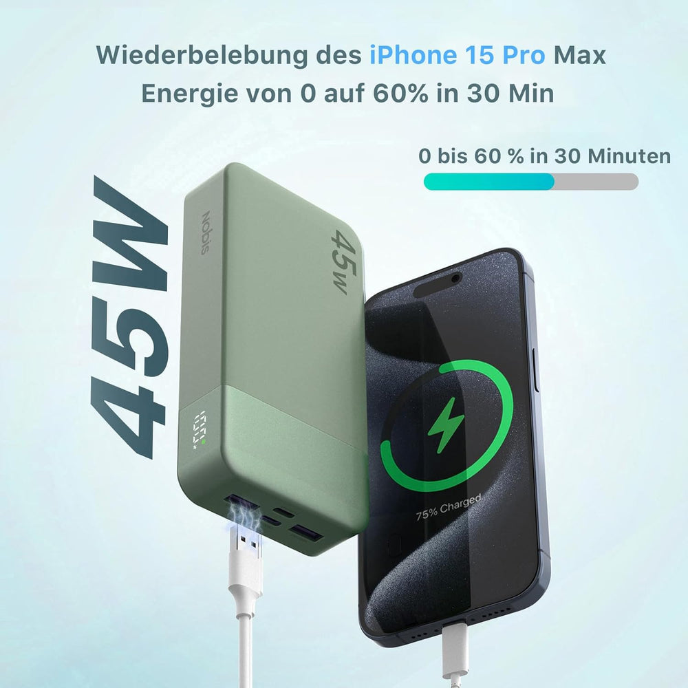 NOBIS Power Bank, Powerbank 20000mAh, 45W Externe Handyakkus Schnellladen, Externer Akku mit C zu C