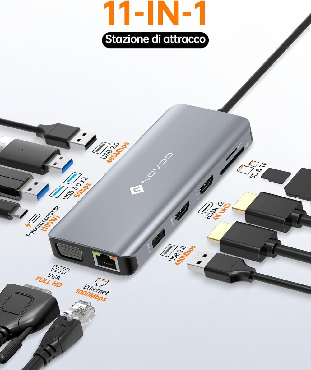 NOVOO Docking Station 11 in 1, USB C Hub Dual HDMI, Multiport Dock USB C auf USB x 4, PD 100W, Gigab