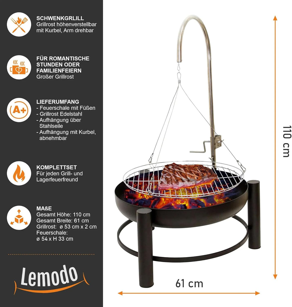 Lemodo Feuerschale mit Grillrost, Feuerkorb für den Garten, Firebowl Ø 75x60 cm, Grillrost schwenkba