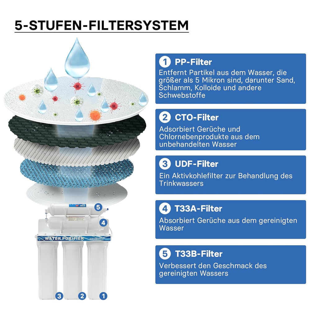 Naturewater NW-PR305 5-Stufenfilter mit Wasserhahn, 2,5m Schlauch, Kurzdreiwegeventil und Kugelhahn