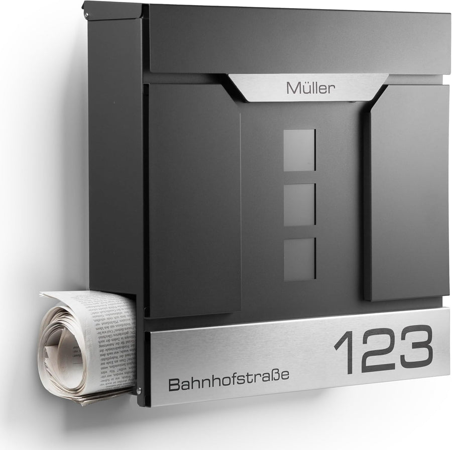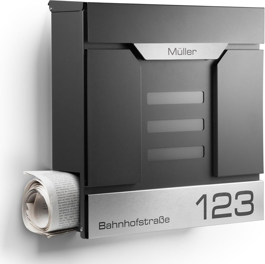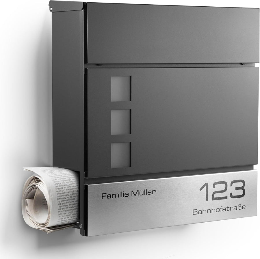 NewHabitat I Moderner Briefkasten Anthrazit mit Zeitungsfach - Wandbriefkasten personalisiert mit Ed