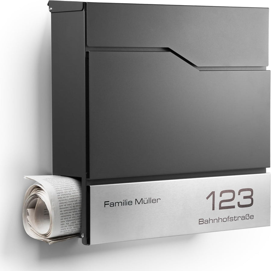Moderner Briefkasten Personalisierbar Madrid Anthrazit RAL7016 - mit Zeitungsfach - Wandbriefkasten